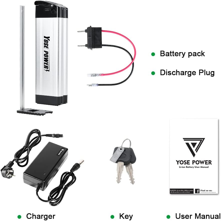 Yose Power 48V 10.4Ah Ebike Battery Sliver Fish Battery with USB Port Electric Bike for 250W/350W/500W Motor Electric Bicycle Seat Tube with Safe Lock Led Indicator Light 2 Pins Discharging Port