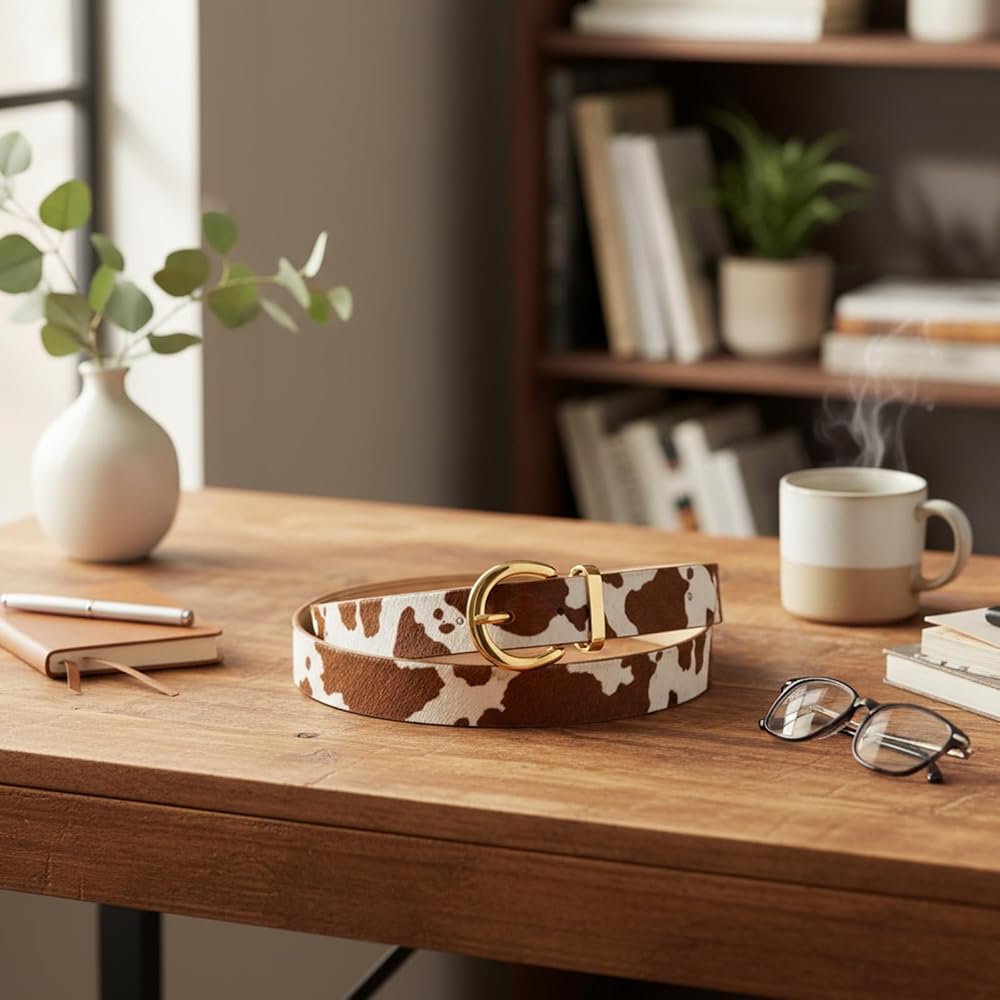 Cow print belt, Cow Print Belt for Women, Western Cowgirl Style Animal Print Adjustable Waist Belt, Fashion Accessory for Jeans and Dresses, Casual Wear and Western Events Cow Print Belt Design: This cow print belt features a distinctive black and white cowhide pattern that adds western charm to your wardrobe; The animal print belt for women combines style with versatility for various fashion preferences; Adjustable buckle allows for personalized fit while maintaining comfort during extended wear Western Style Construction: Crafted with attention to western aesthetics, this cowboy belt for women incorporates traditional design elements; The cowprint belt features a sturdy buckle mechanism that provides closure; Animal print belt design maintains its visual appeal through multiple wears; This cow belt is designed to complement western-themed outfits while offering everyday functionality Versatile Wearing Occasions: This cow print belts for women pairs well with jeans for casual outings and dresses for special events; Ideal for festivals, rodeos, and social gatherings where western fashion is appreciated; The animal print belt for women transitions seamlessly from daytime casual to evening wear; Cowhide belt design works with various clothing styles from skirts to denim Adjustable Comfort Fit: The cow belt women features an adjustable design that accommodates different waist sizes; Buckle mechanism allows for precise fit adjustments while maintaining the belt's structural integrity; This cowprint belt is designed for all-day comfort on style; The cowboy belt for women offers fit that stays in place during movement Fashion Statement Value: This cow print belt makes a distinctive addition to any western-inspired outfit; The animal print belt for women brings character to casual and dressy ensembles alike; Cowhide belt pattern adds visual interest to simple outfits; This cow belt women enhances personal style while reflecting current fashion trends