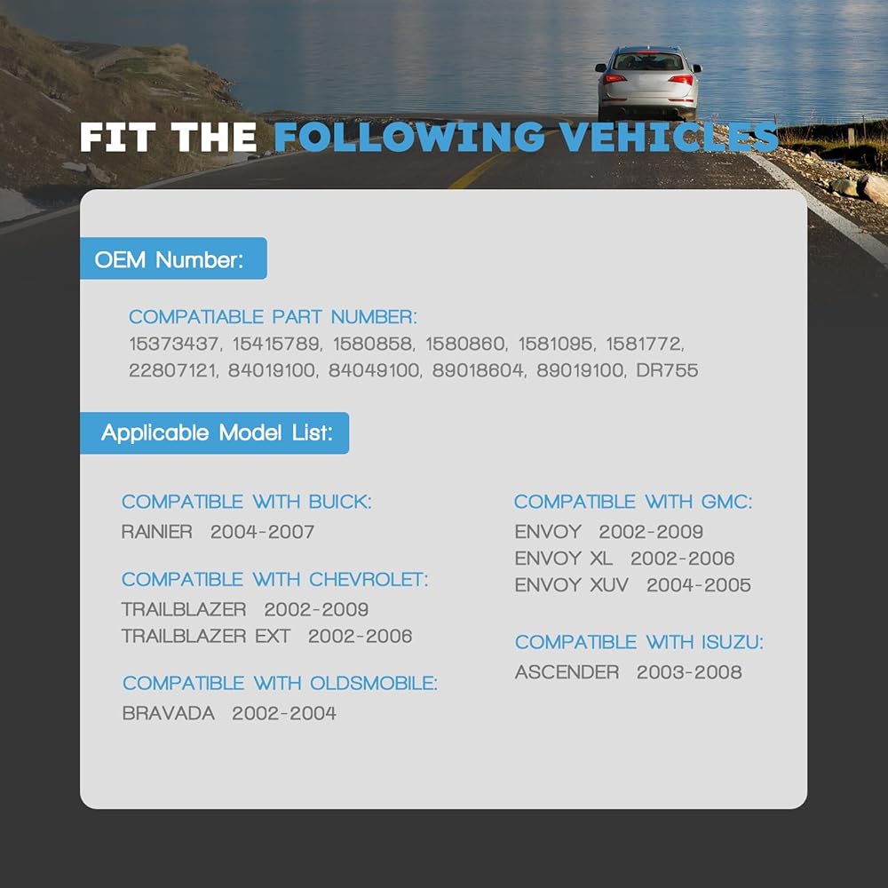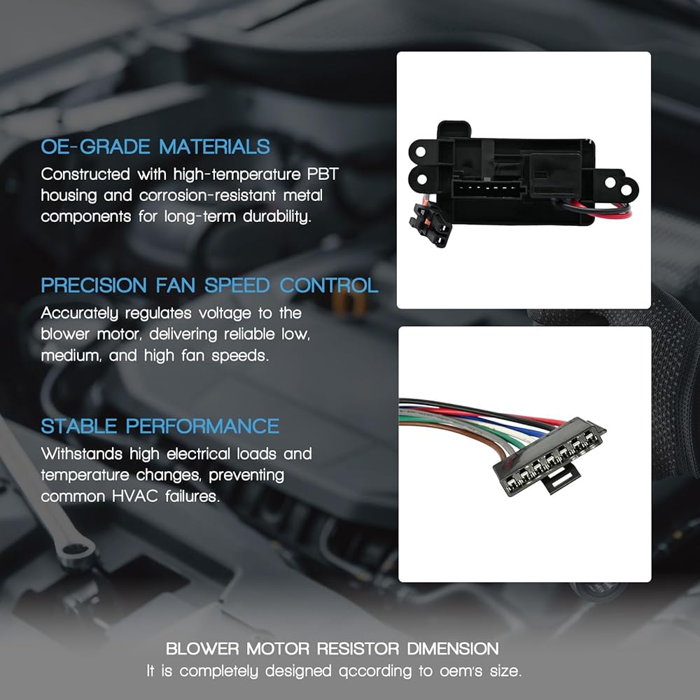 【Fitment】: HVAC Blower Motor Resistor fit for Buick Rainier 2004-2007; Fit for Chevrolet Trailblazer 2002-2009, Trailblazer Ext 2002-2006; Fit for Gmc Envoy 2002-2009, Envoy Xl 2002-2006, Envoy Xuv 2004-2005; Fit for Isuzu Ascender 2003-2008; Fit for Oldsmobile Bravada 2002-2004【Replace Part Number】: HVAC Blower Control Module Replaces# 15373437, 15415789, 1580858, 1580860, 1581095, 1581772, 22807121, 84019100, 84049100, 89018604, 89019100, DR755 --- Before purchasing this HVAC fan motor resistor, please enter your vehicle【High Quality Materials】: This air conditioning blower motor resistor is made of durable copper interface and aluminum column, which has the advantages of impact resistance, heat resistance, and aging resistance. It can prevent poor connection, prevent excessive current from burning out the blower, ensure efficient operation, and extend service life.【Function】: The blower motor resistor controls the fan speed of the blower motor by changing the resistance. If your blower motor is stuck at a certain speed and the fan does not work under certain settings, the vehicle ventilation port will not blow air. This blower motor resistor can perfectly solve this problem.【Package Includes】:1 X HVAC Blower Motor Resistor, 1 X AC Blower Control Module Wire Harness