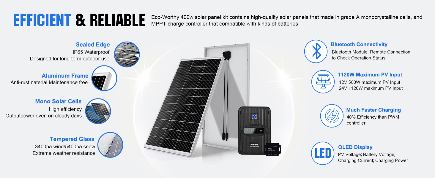 ECO-WORTHY 400 Watt 12 Volt Premium Solar Panel Kit :4pcs 100W Solar Panel+ 40A MPPT Charge Controller+ Bluetooth Module+ Mounting Z Brackets, 400W 12V Solar Power Off Grid System for Home, RV, Boat.
