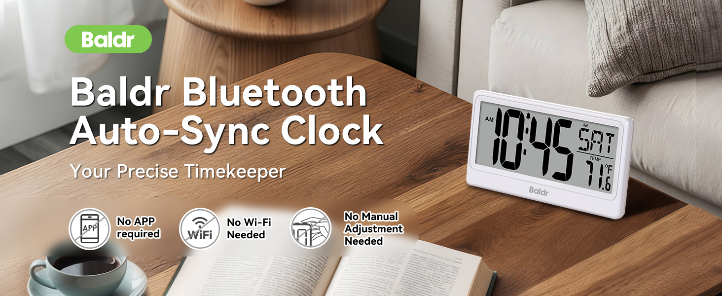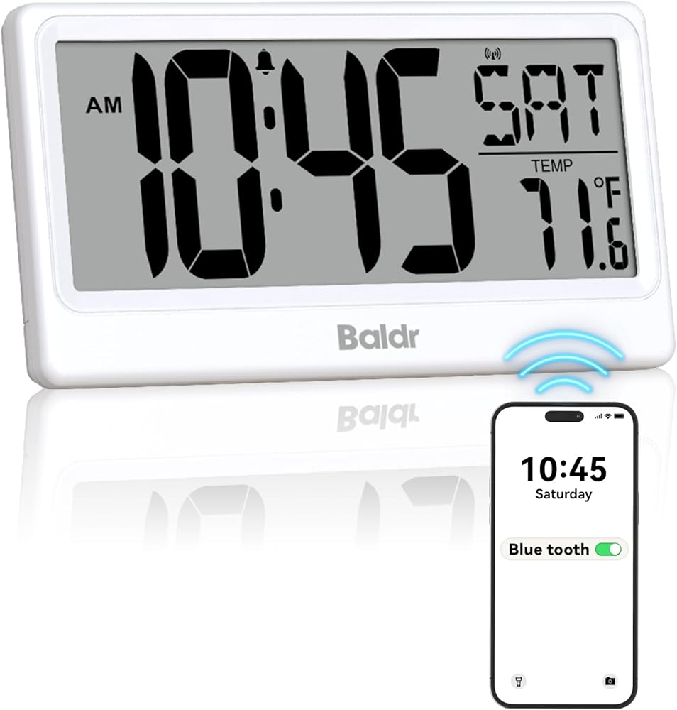 Baldr Digital Clock with Bluetooth Auto Time Sync, No App Required, Large Display Desktop Alarm Clock, Battery Operated, Temperature & Weekday, Wall or Desk Clock for Home Office, White