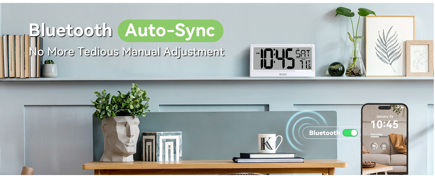 【𝗕𝗟𝗨𝗘𝗧𝗢𝗢𝗧𝗛 𝗔𝗨𝗧𝗢-𝗦𝗬𝗡𝗖】Say goodbye to manual settings. This modern desk clock automatically syncs time with your smart device via Bluetooth—no app and wifi required. Enjoy hassle-free, to-the-second accuracy every single day.