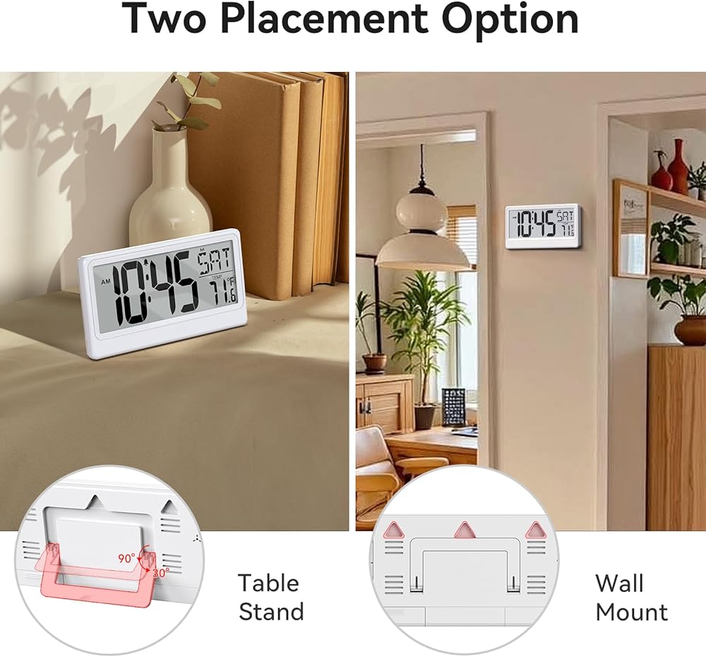 【𝗩𝗘𝗥𝗦𝗔𝗧𝗜𝗟𝗘 𝗣𝗟𝗔𝗖𝗘𝗠𝗘𝗡𝗧】Designed to fit any space, the digital alarm clock can be wall-mounted or used as a tabletop display. Featuring three hanging holes and a sturdy, foldable stand, it ensures a stable, wobble-free setup in your bedroom, kitchen, or office.
