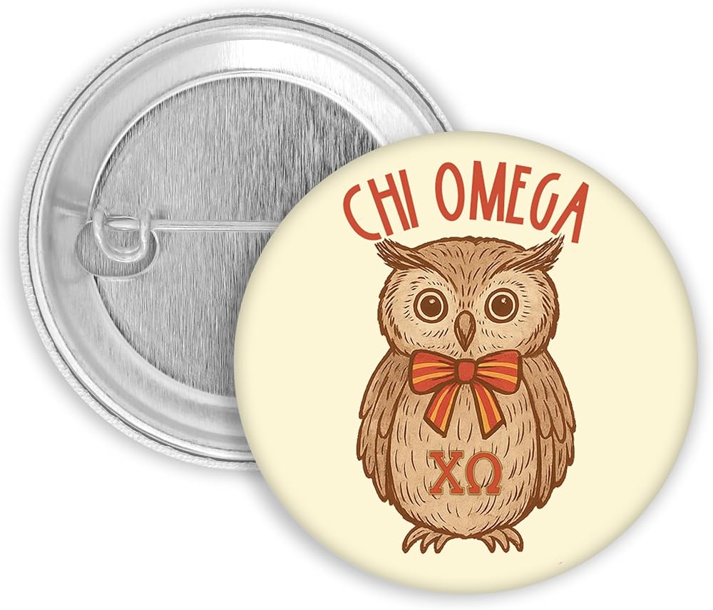 SET INCLUDES: Two Unique Designs – One 2.25" round button with Owl and Chi Omega, and one heart-shaped gingham XO pin; wear separately or as a matching set.