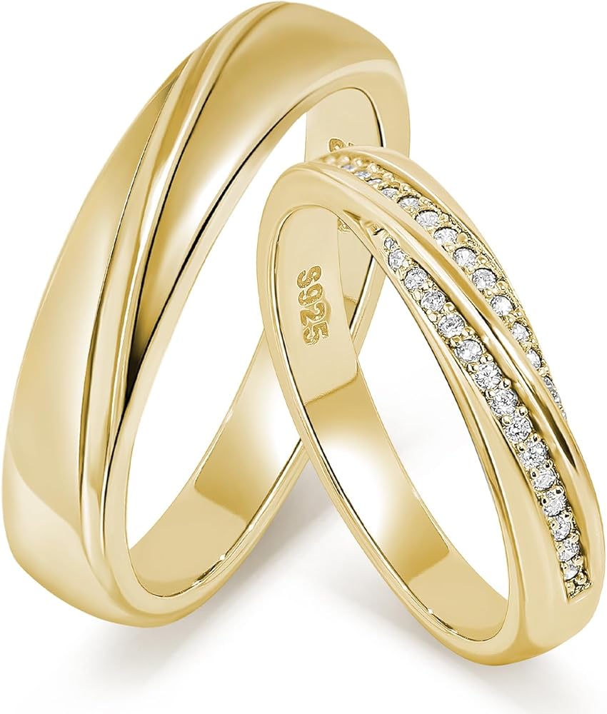 【925 Sterling Silver Gold Plated Matching Rings】Crafted from solid 925 sterling silver with a durable gold plated finish these couples rings offer lasting shine and skin friendly wear. The women's ring features a row of sparkling stones adding elegance while the men's band remains sleek and polished for a classic look. A refined option for customers searching for matching wedding rings promise bands or engagement ring sets