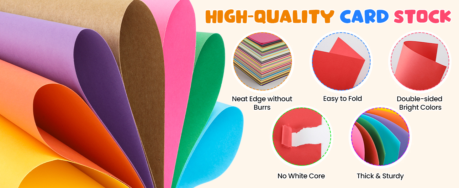 Sturdy and Resilient: Our colored construction papers are crafted from premium 180GSM (65lb) cardstock, this paper strikes the perfect balance between thickness and flexibility. Its firm texture resists warping, ensuring your handmade creations maintain a three-dimensional, high-end look while remaining easy to fold and cut. It provides a solid foundation for your projects