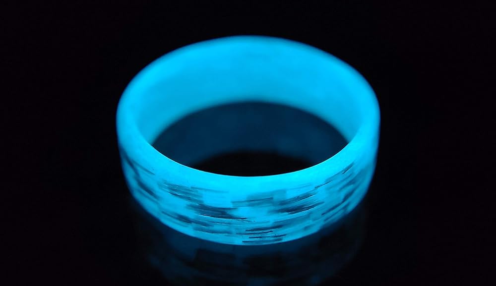 Glow - We use a Non-toxic strontium aluminate infused in our resin for the glow. Glow times vary depending on charge time and sunlight exposure/UV exposure. When charged with a UV light for 5 to 10 seconds, the ring will glow strong for a couple of minutes then the glow will dim for one to four hours. It is necessary to be in a dark or dimly lit space to see the full affect of the glow. The ring can be recharged for 10+ years.