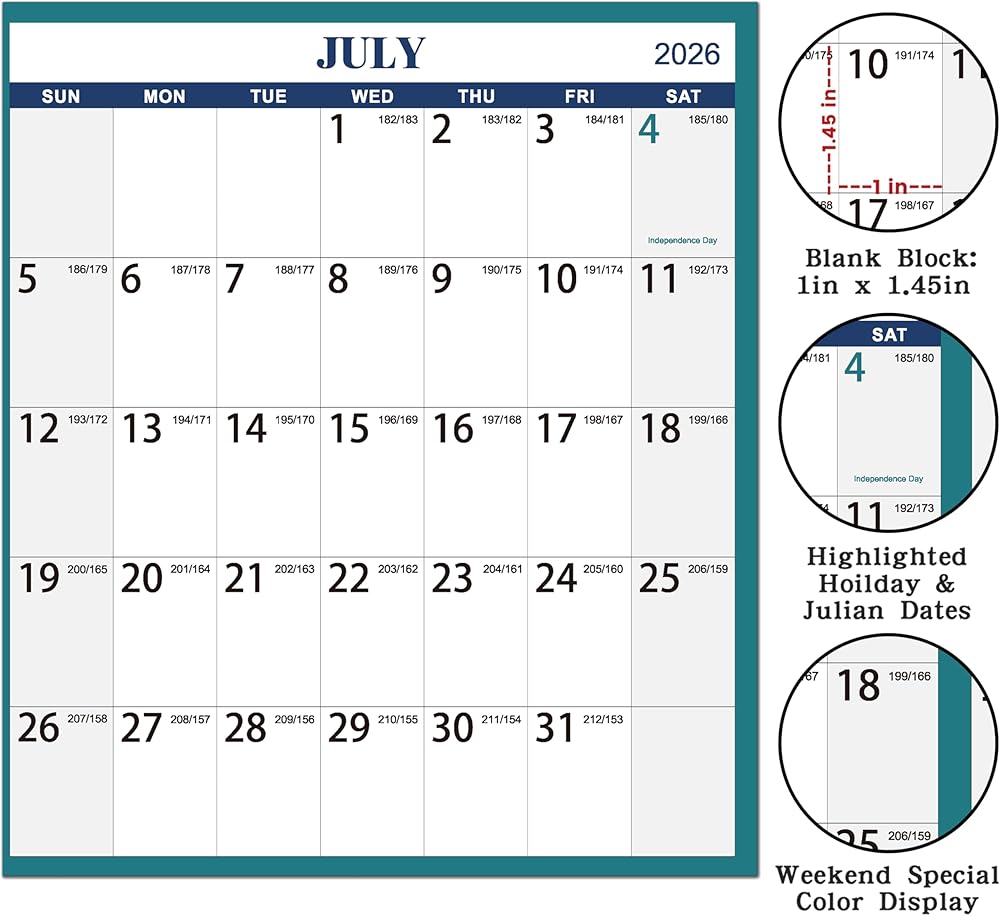2026 Calendar Blocks - Each wall calendar 2026 has large blocks for scheduling and notes. Vertical side blocks measure 1.5" x 1.25" (3.8cm x 3.2cm) - Horizontal side blocks measure 1.25" x 1.25" (3.2cm x 3.2cm). Bold large print with bright white background for easy viewing and reading.