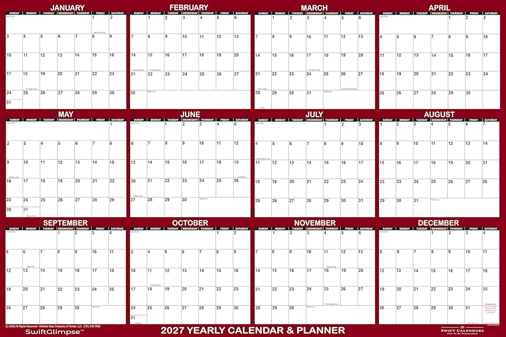 SwiftGlimpse 2027 Erasable Wall Calendar: Our yearly wall calendars give you a "glimpse" and huge poster display of all 12 months, January to December - in one X Large view to keep you organized all year long. Track projects, create schedules, make daily notes, schedule vacations or simply just glimpse ahead at future months. Federal holidays are highlighted in red for clear differentiation. Large unruled, daily blocks. SwiftGlimpse wall calendars will give you plenty of space to jot down important notes and reminders for the year. Features a contemporary design and printed in blue and black inks as shown on quality heavy-duty papers. LAMINATED Calendars! Each erasable calendar is laminated on both sides with a durable 3mil lamination - perfect for use with wet or dry erase markers. Note: we highly recommend "Wet Erase" markers! Why? Unlike dry markers, Wet Erase does not fade - does not stain or ghost - does not accidentally rub off if brushed up against - and comes completely clean with a damp cloth! For best results - please use our branded SwiftGlimpse line of Wet Erase Markers! Easy DIY hanging with thumb tacks, velcro or double sided foam tapes or 3M Command Strips (not included) SwiftGlimpse Wall Calendars are available in a variety of large wall sizes: 18x24, 24x36, 32x48, 36x54 and now a massive jumbo 48x72. This edition is printed on both sides and allows for reversible hanging based on your wall space. Hang vertically or horizontally. Only the best from the SwiftGlimpse Brand of popular wall calendars. Proudly Made in America!