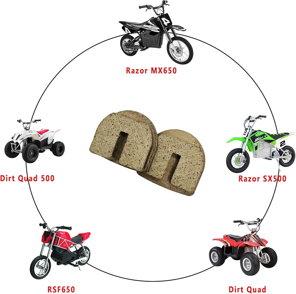 Fitment: The rounded front disc brake pads fit Razor MX650 MX500 SX500 Mcgrath Dirt Rocket Bike, RSF650/ RSF350 Street Bike, Razor Dirt Quad 4 Wheeler ATV, Razor E500S Scooter, Razor Pocket Mod Bellezza Scooter, YK2 Flame Disc Brake Caliper parts