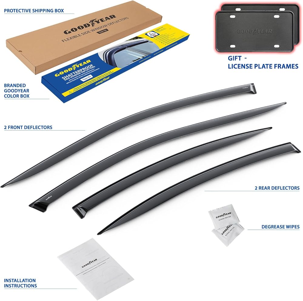 Get a perfect gift right now - 2 Goodyear License Plate Frames are included in the set. No tools needed simply peal and stick these window vent visors rain guards. We include degreasing wipes to make the job quick. This vent shade is a great birthday gift or holiday present for anyone who likes to drive with the window down. Side window deflectors come in a Goodyear color box protected by a brown shipping box.