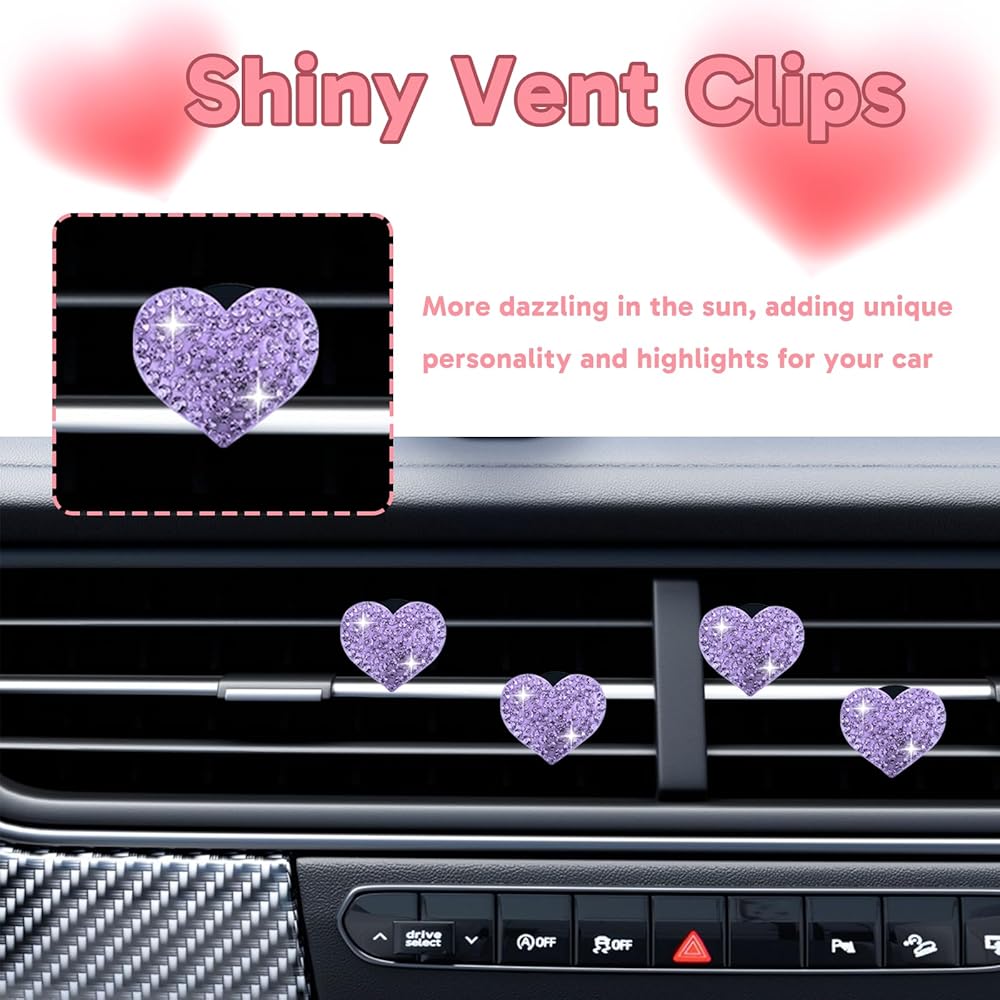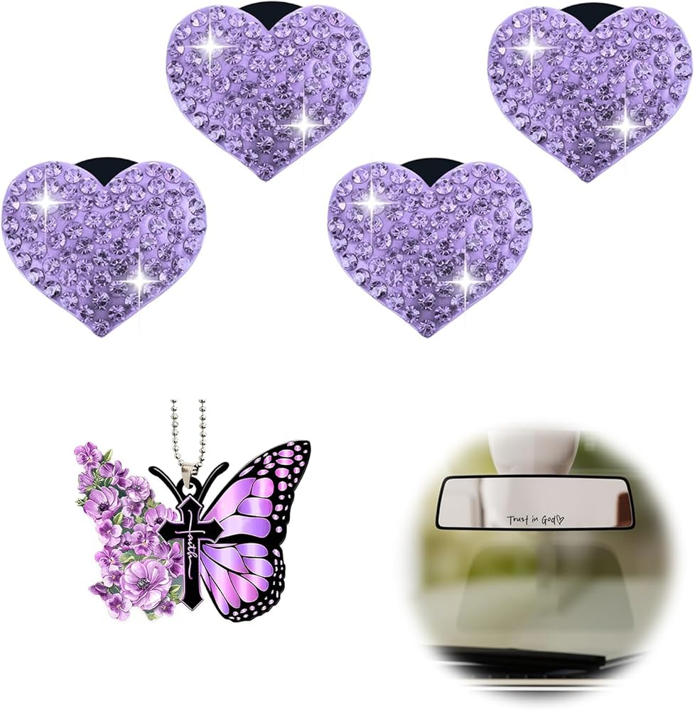 9PCS Purple Car Accessories for Women,4PCS Heart-Shaped Car Vent Clips with Rhinestone,1PCS Purple Butterfly Decoration, 4PCS "Trust In God" Rearview Mirror Stickers, Stylish Car Decoration Set