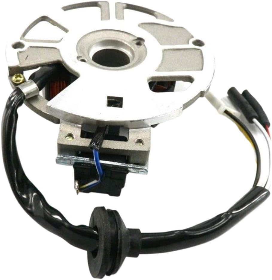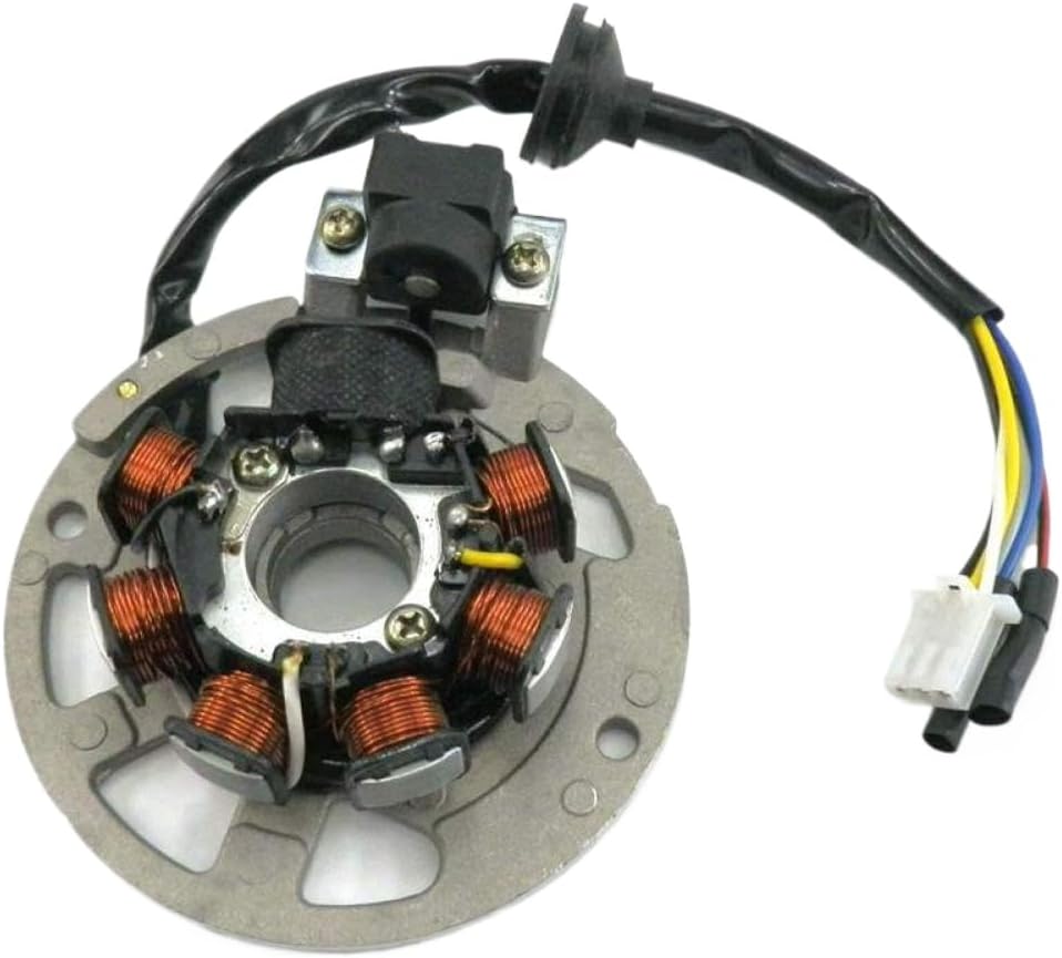 Stator magneto coil designed for 2-stroke 49cc and 50cc engines with 1PE40QMB, JOG, Minarelli compatible applications.This unit features a 5-wire configuration with a 3-pin connector and includes a 7-coil winding setup.It is suitable for use in , and ATVs requiring this specific stator type.The coil supports ignition and functions typical of small displacement 2-stroke engine systems.