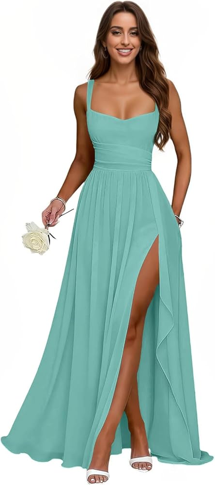 Style:Chiffon Bridesmaid Dresses 2026,Sleeveless Evening Party Dress, Modest Square Neck Maid of the Honor Dress for Women, Sweetheart A Line Long Wedding Guest Dresses 2026, A Line Evening Gown with Slit, Prom Dresses with Pockets, Prom Dress with Slit, Bridesmaid Dress with Pocket