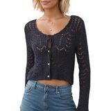 Features: Long sleeve crochet knitted button down top, tie front hollow out knit cardigan for women, this y2k boho clothes, e-girls aesthetic button up knit top features in a v neck front lace up cardigan sweater, solid long sleeve button front crochet knit top.