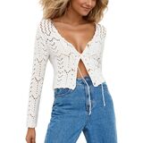 Naileksi Women Tie Up Hollow Out Knit Crop Cardigan Sexy V Neck Long Sleeve See Through Solid Button Down Crochet Top