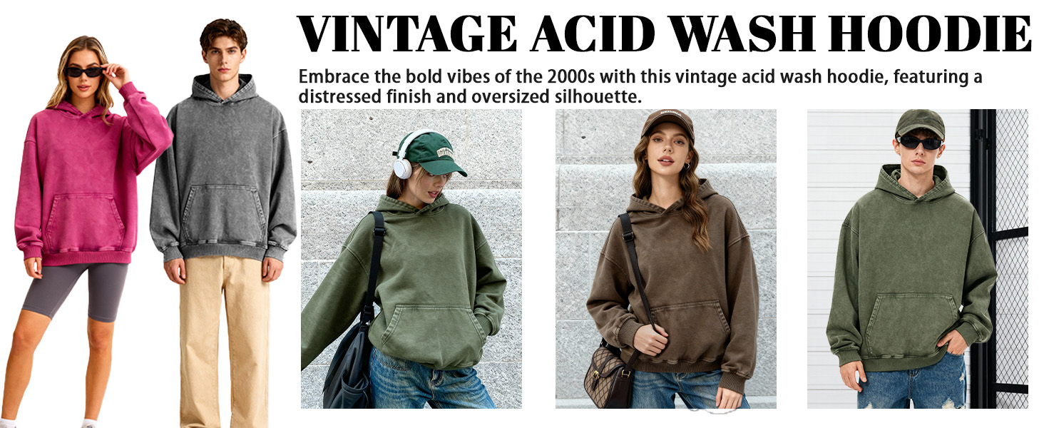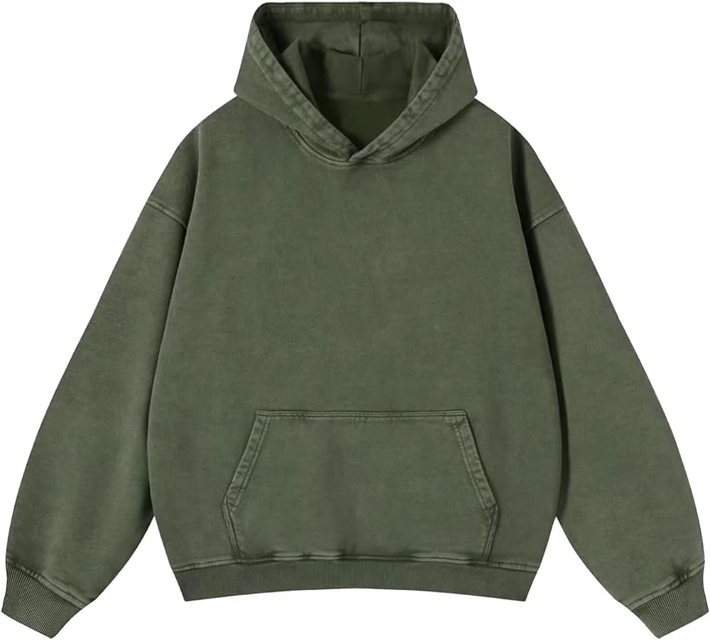 Features: The washed hoodie with a kangaroo pocket for storage. Elastic ribbed cuffs and hem, round neck, solid color, blank, dropped shoulders, long sleeves, fashionable. Acid-washed fabric creates a unique faded pattern and vintage aesthetic.