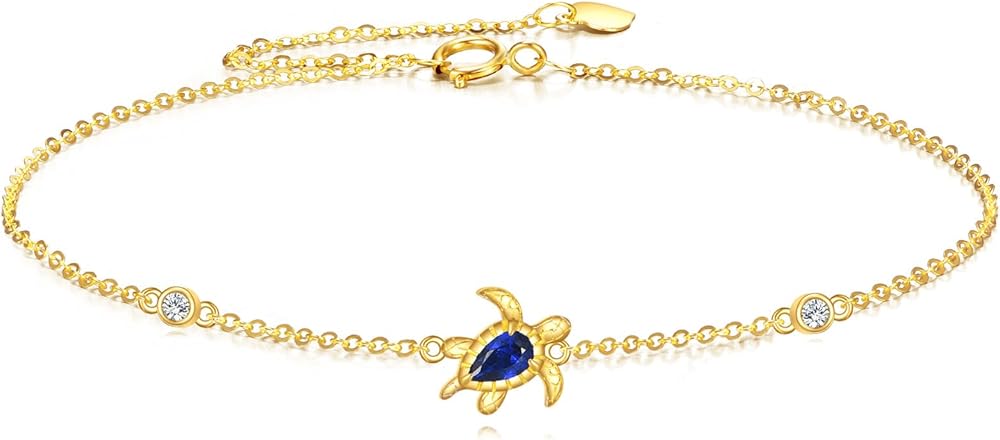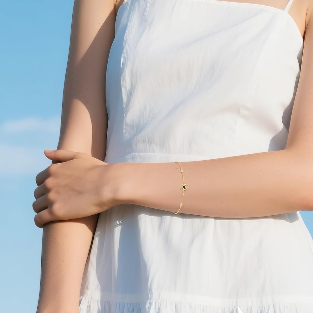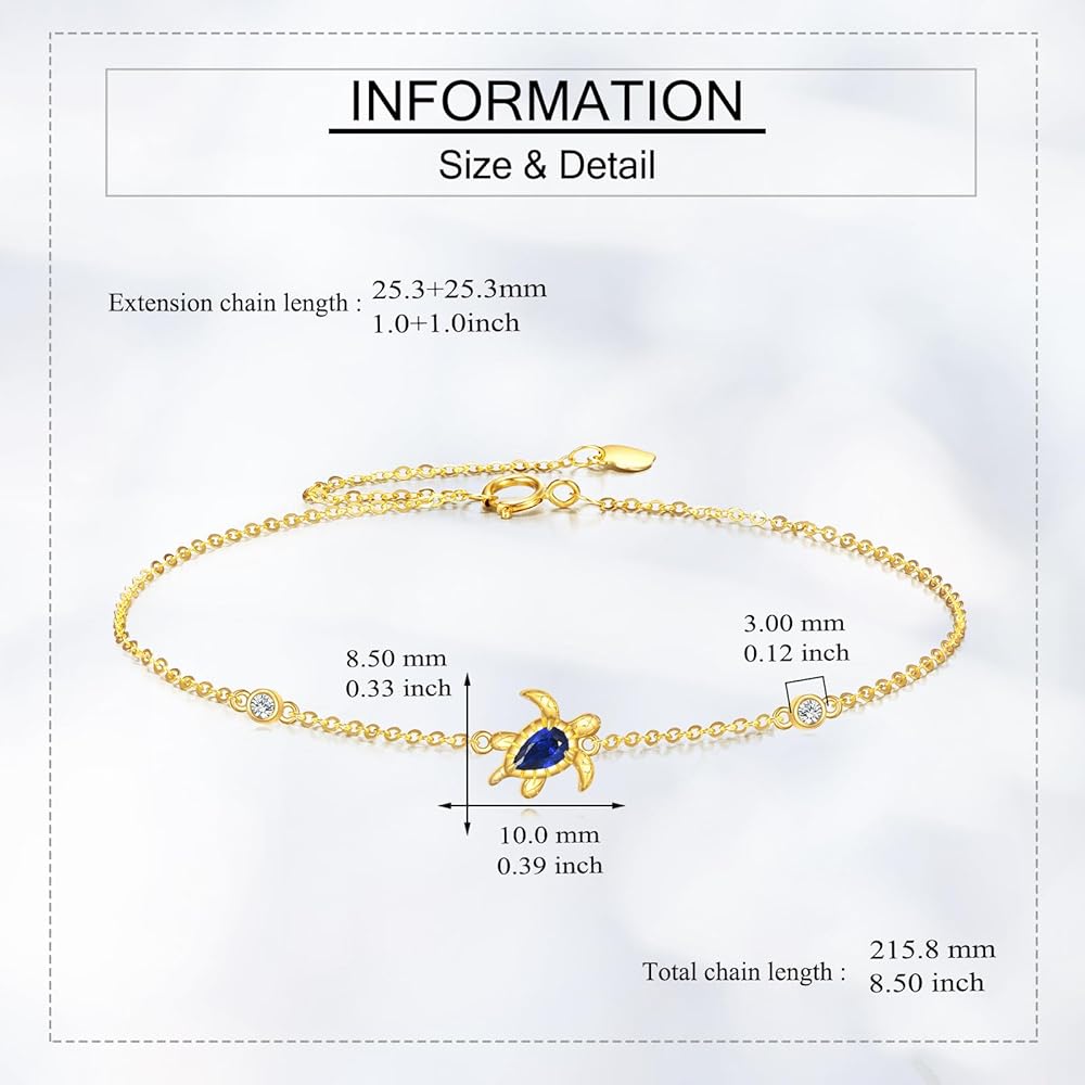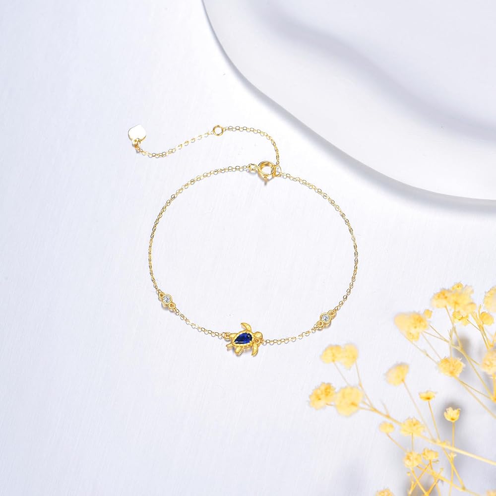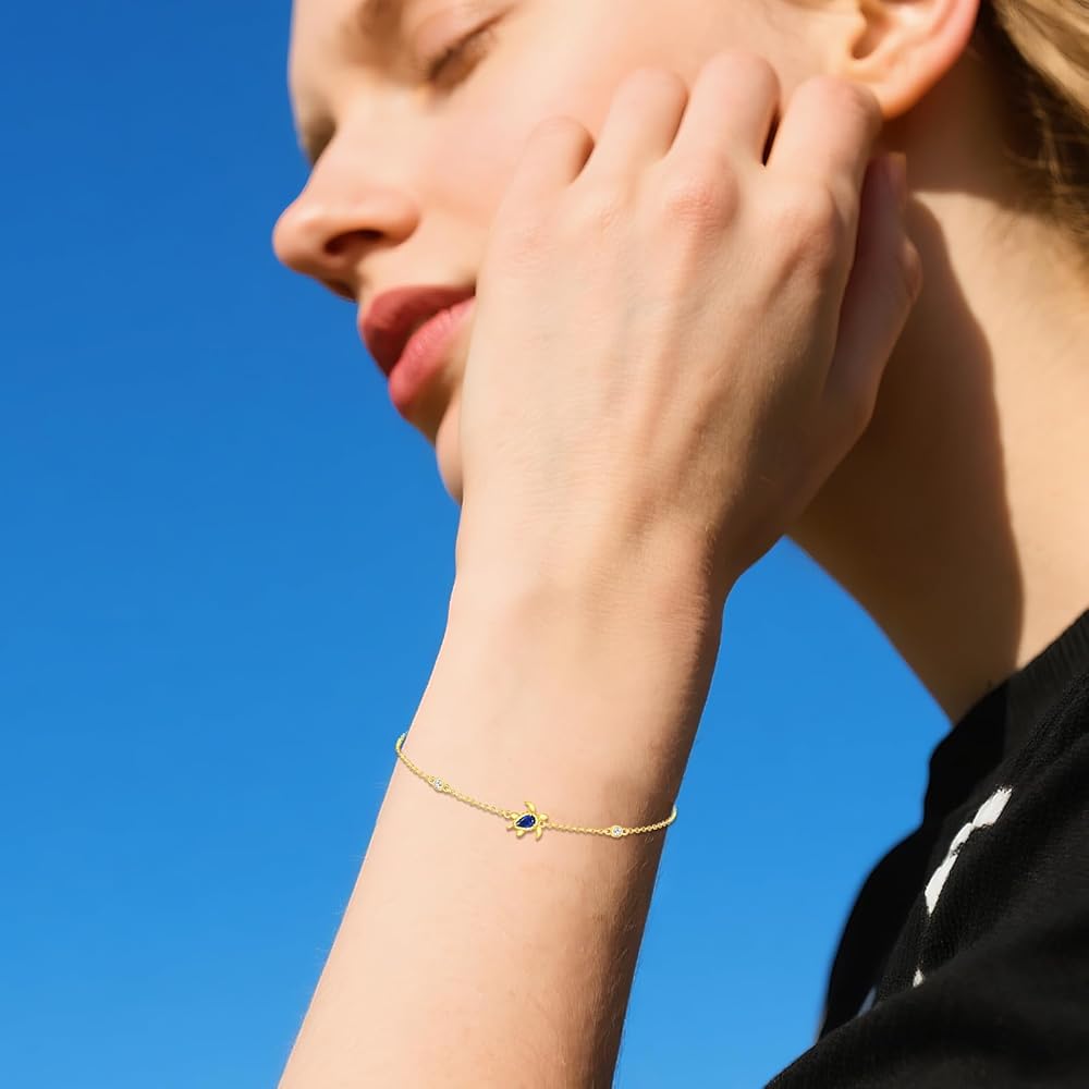 【14K Gold Turtle Bracelet】 Exquisite 14K solid yellow gold turtle bracelet showcases a graceful turtle charm adorned with a single teardrop-cut lab-grown blue sapphire. The slender chain and minimalist design create a delicate yet eye-catching piece that works beautifully when worn alone or layered with other bracelets. The balanced proportions ensure comfortable all-day wear while adding a refined touch to any jewelry collection