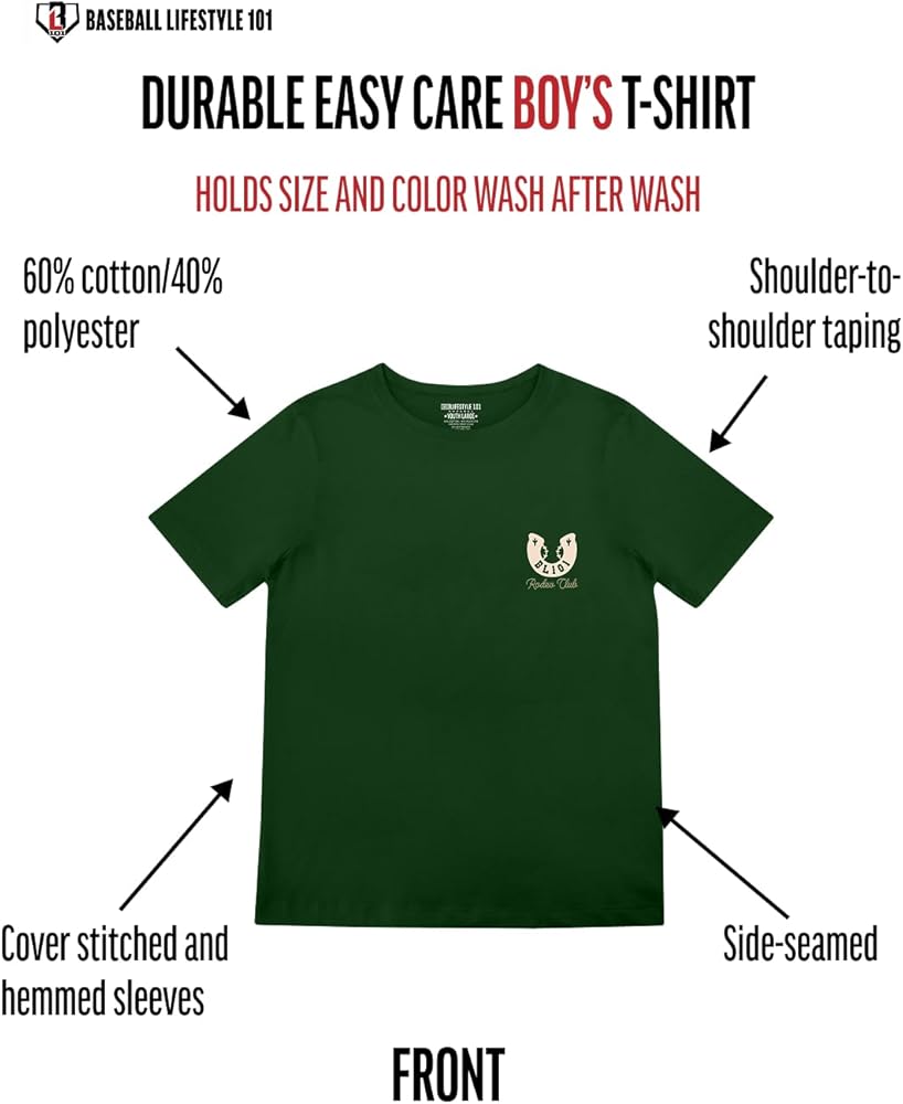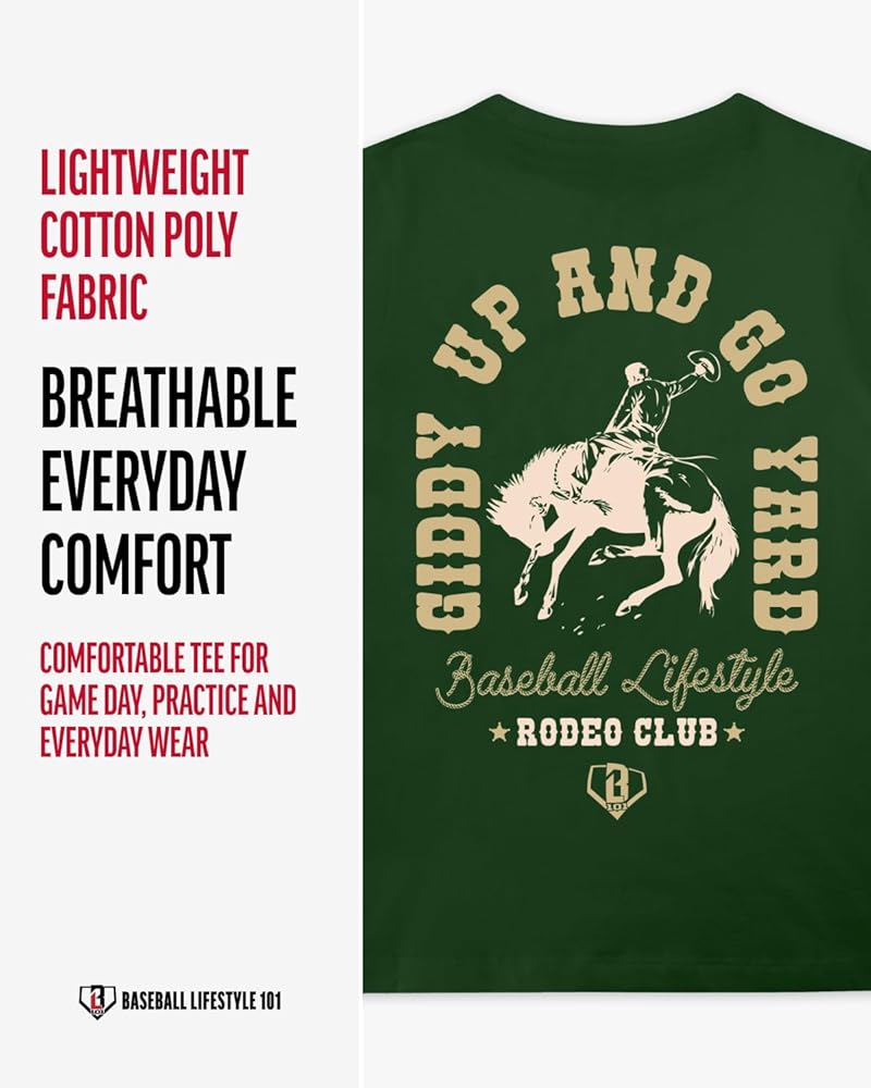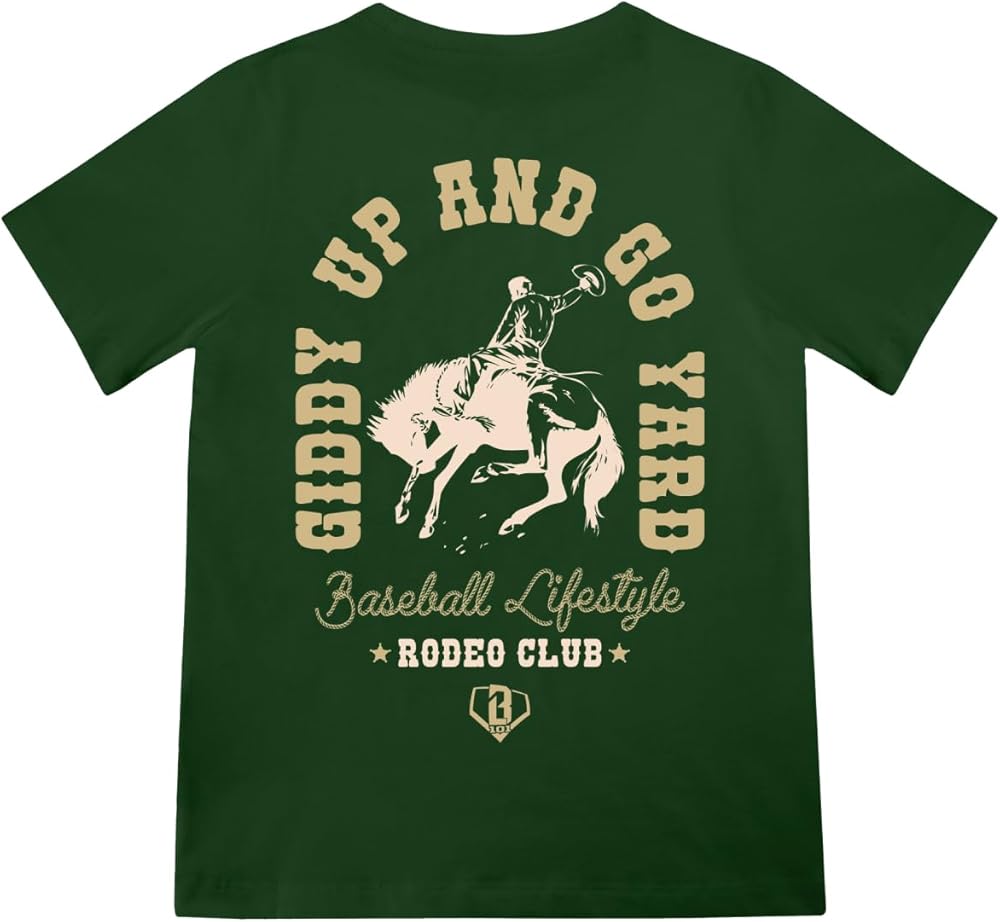 Boys short sleeve t-shirt that brings wild west energy to the diamond. Rodeo Club tee features a bull rider graphic with Giddy Up And Go Yard and Baseball Lifestyle Rodeo Club branding. Screen printed artwork built for players who stay in the saddle through every pitch, swing, and grind.