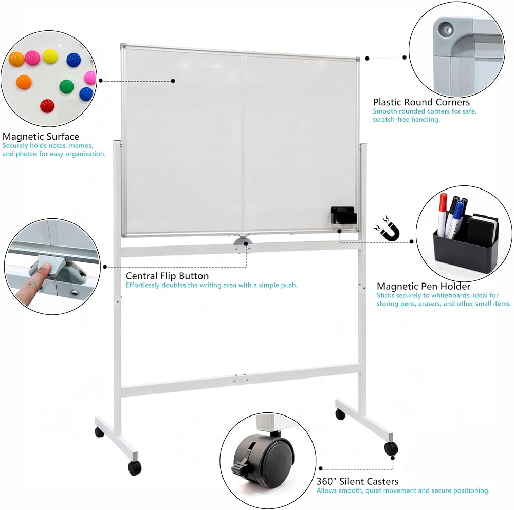 Rolling Whiteboard with 360° Casters: Equipped with silent, lockable wheels, it moves effortlessly on hard floors or carpets, making it ideal for classrooms, offices, or home use.
