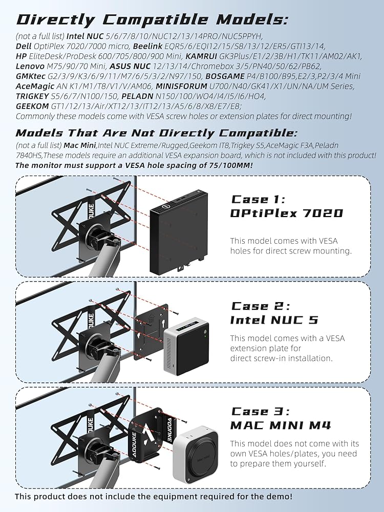 5. Can not be directly compatible with the device: (not a full list) Mac Mini, In tel NUC Extreme/Rugged, Gee kom IT8, Trigkey S5, Ace Magic F3A, Pel adn 7840HS common these models do not have VESA holes need to be additional with the expansion board, this product does not contain! This product does not include the expansion board, if you need to use it, you need to prepare it by yourself!