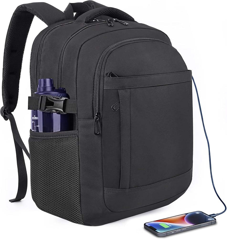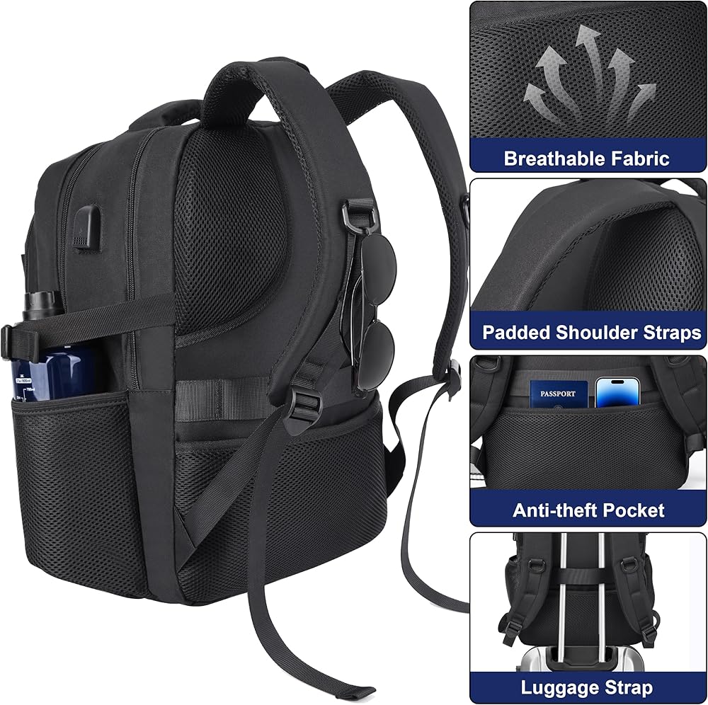 Thoughtfully Organized Capacity: With a 30L capacity, it accommodates laptops up to 18 inches. The main compartment and front organizer keep essentials neatly arranged, while two side pockets conveniently hold water bottles or umbrellas, and a discreet back panel security pocket safely stores cash, cards, and valuables.