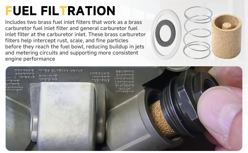 Fuel Filtration:Includes two brass fuel inlet filters that work as a brass carburetor fuel inlet filter and general carburetor fuel inlet filter at the carburetor inlet. These brass carburetor filters help intercept rust, scale, and fine particles before they reach the fuel bowl, reducing buildup in jets and metering circuits and supporting more consistent engine performance