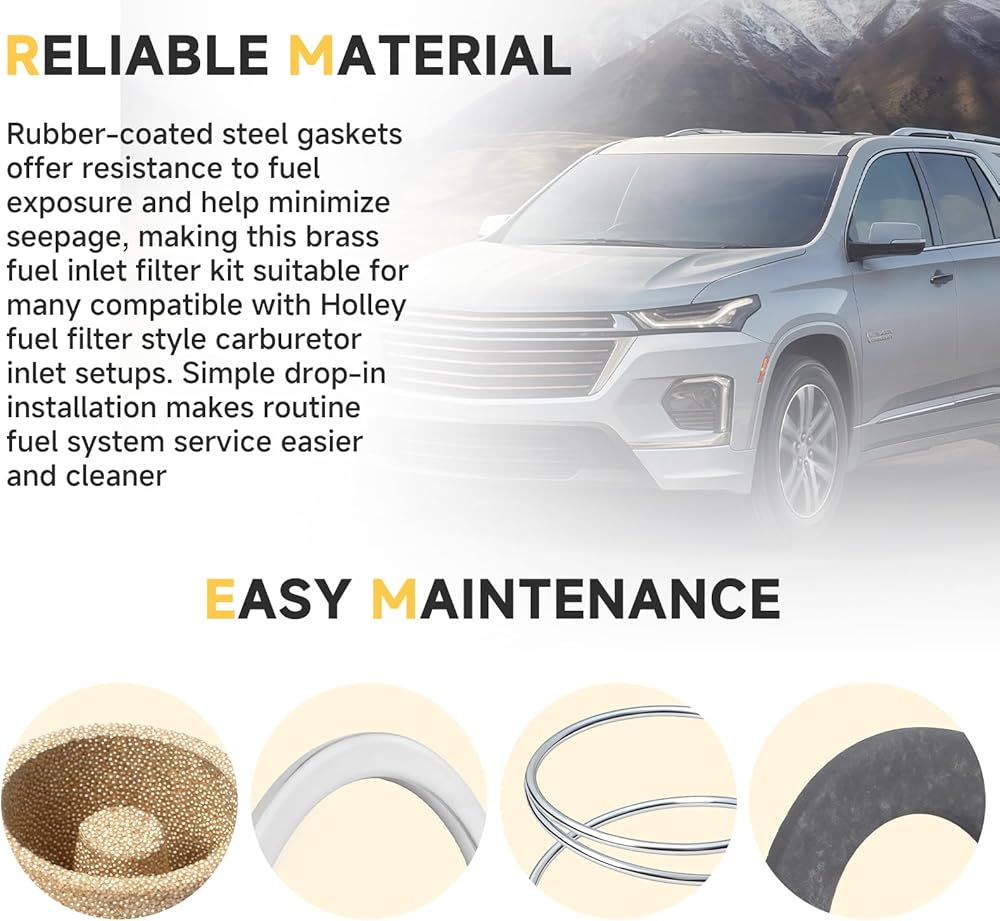 Reliable Material & Easy Maintenance:Rubber-coated steel gaskets offer resistance to fuel exposure and help minimize seepage, making this brass fuel inlet filter kit suitable for many compatible with Holley fuel filter style carburetor inlet setups. Simple drop-in installation makes routine fuel system service easier and cleaner