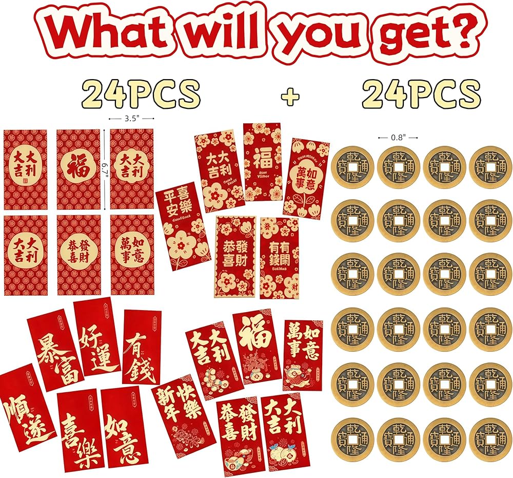 Package Includes: You will get 24 pieces Chinese New Year red envelopes in 24 unique patterns, each with a size of about 3.5 x 6.7 In; You will also get 24 pieces Chinese antique copper coins with a diameter of about 0.8 inch. Perfect for Chinese New Year 2026, weddings, birthday parties, family visits, and other festive events.