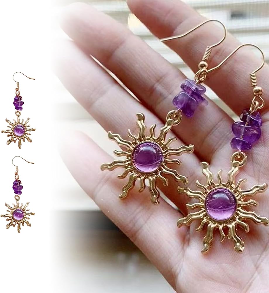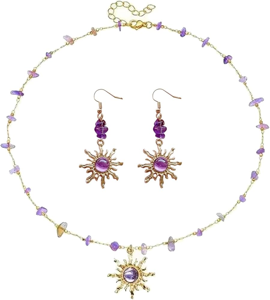 This Y2K-style gold jewelry set (includes necklace + stud earrings) features sun motifs paired with amethyst—a symbol of protection and tranquility—crafted with 18K gold plating for a minimalist, sleek look. Made of 18K real gold plating, nickel-free and lead-free materials, it's skin-friendly and safe; inlaid with rhinestones and handcrafted, each piece has slight unique variations. Versatile for both casual and formal occasions, it can be worn separately or together. Elegantly gift-boxed, it's an ideal present for birthdays, Valentine's Day and other special occasions. To maintain its shine, store it in a cool, dry place and clean gently with a soft cloth and warm soapy water. With great value for money and long-lasting elegance, it's a fantastic addition to any jewelry collection.