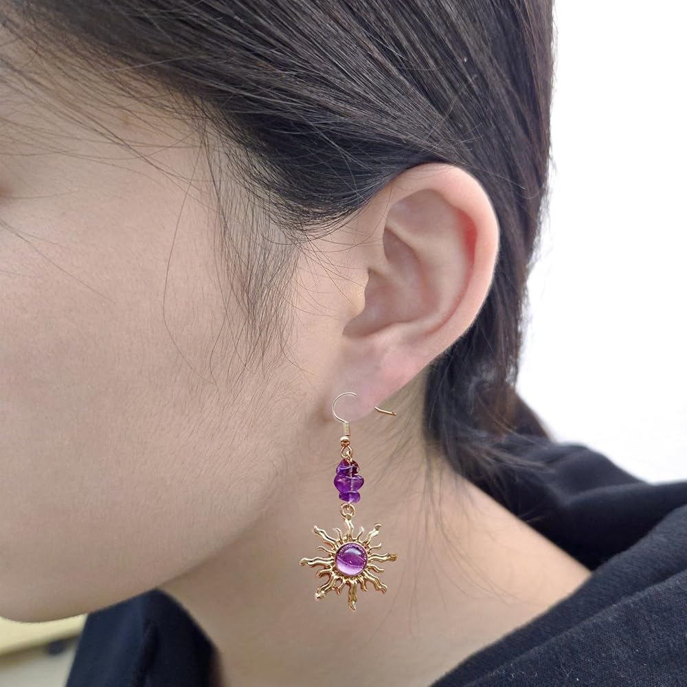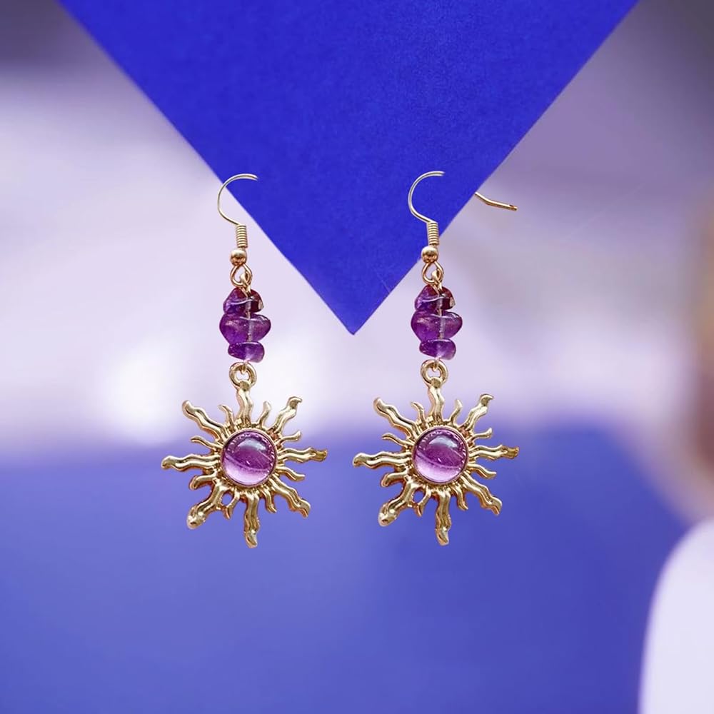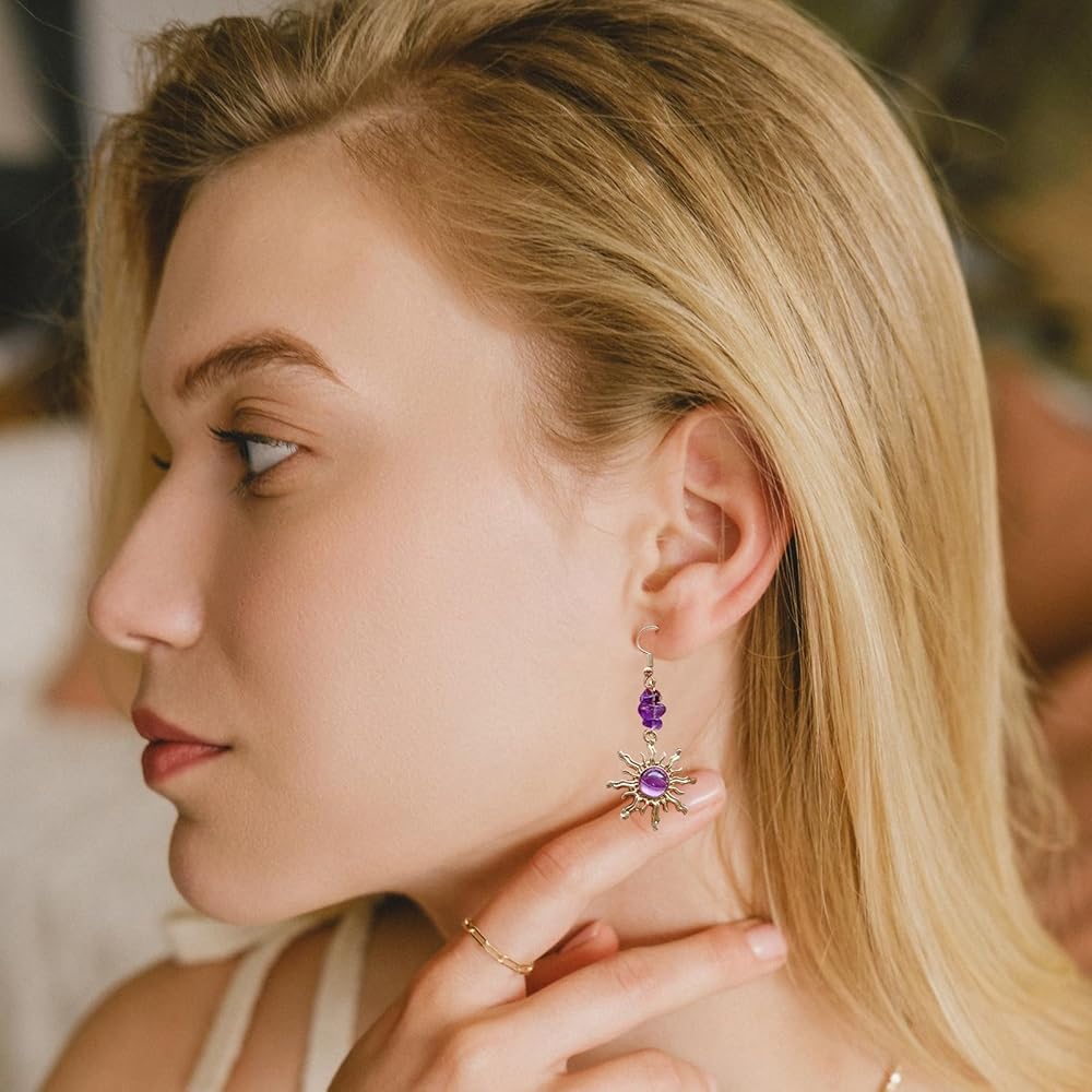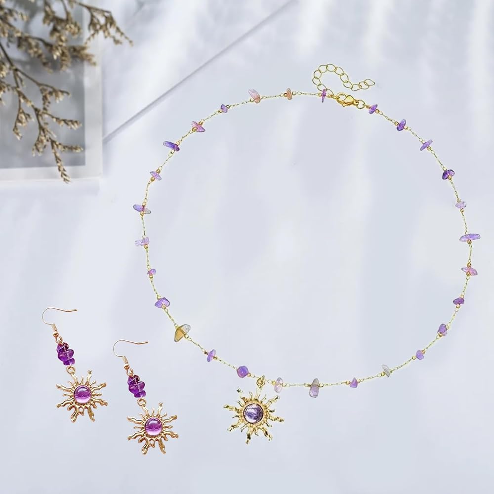 Enchanted Hammered Sunflower & Amethyst Charm: This set blends a delicate hammered sunflower design with amethyst—a revered spiritual stone that nurtures emotional balance, clear thinking, and inner peace. It may also ease stress, boost spiritual awareness, and even enhance understanding and memory, all elevated by a luxe 18K gold-plated finish for a minimalist yet captivating look