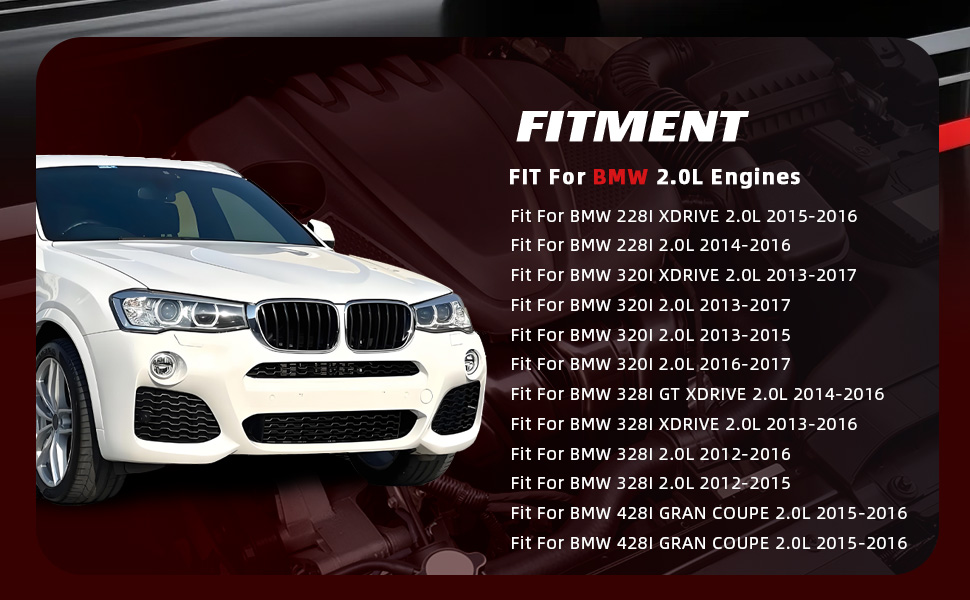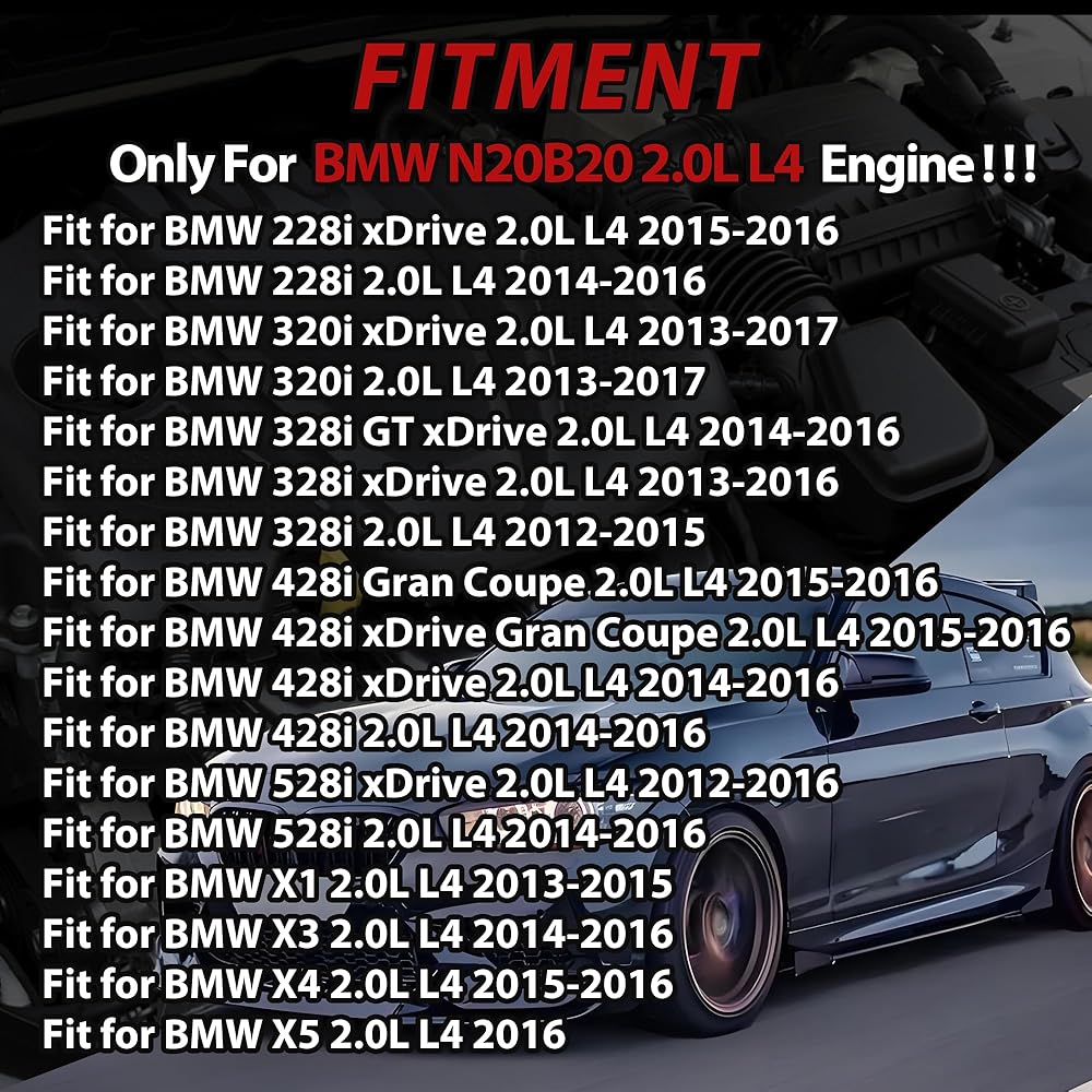 Fitment: Fit for BMW 228i xDrive 2.0L L4 2015-2016; Fit for BMW 228i 2.0L L4 2014-2016; Fit for BMW 320i xDrive 2.0L L4 2013-2017; Fit for BMW 320i 2.0L L4 2013-2017; Fit for BMW 328i GT xDrive 2.0L L4 2014-2016; Fit for BMW 328i xDrive 2.0L L4 2013-2016; Fit for BMW 328i 2.0L L4 2012-2015; Fit for BMW 428i Gran Coupe 2.0L L4 2015-2016; Fit for BMW 428i xDrive Gran Coupe 2.0L L4 2015-2016; Fit for BMW 428i xDrive 2.0L L4 2014-2016; Fit for BMW 428i 2.0L L4 2014-2016; Fit for BMW 528i xDrive 2.0L L4 2012-2016; Fit for BMW 528i 2.0L L4 2014-2016;