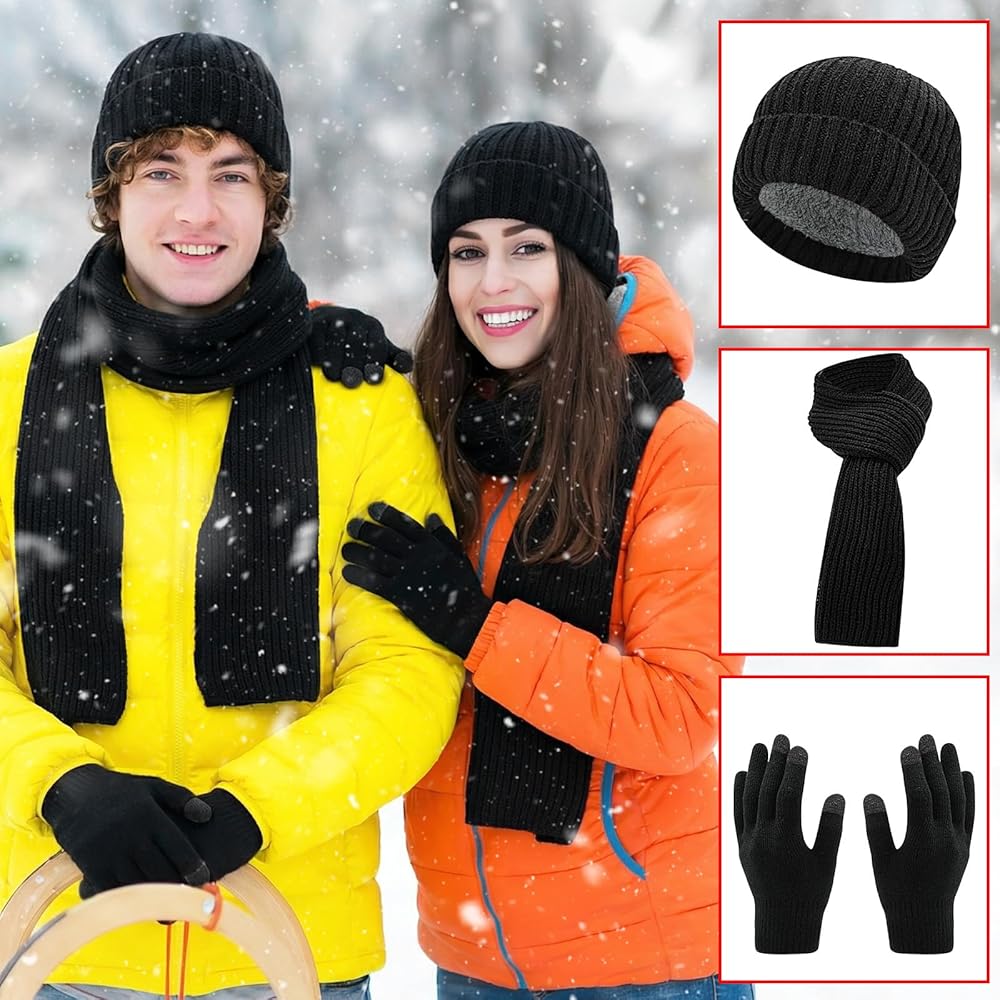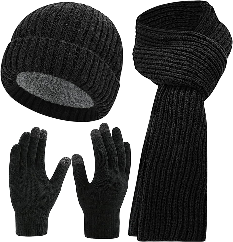3 Pcs Hat Gloves Scarf Set Black Winter Hats Knit Beanie Touchscreen Glove Long Scaves Themal Skull Caps for Men Women