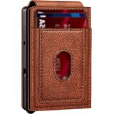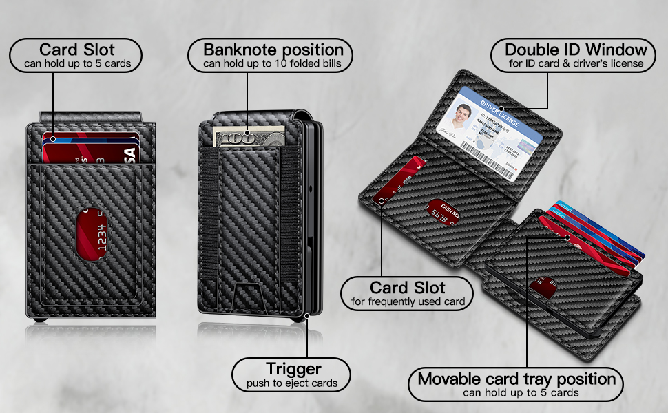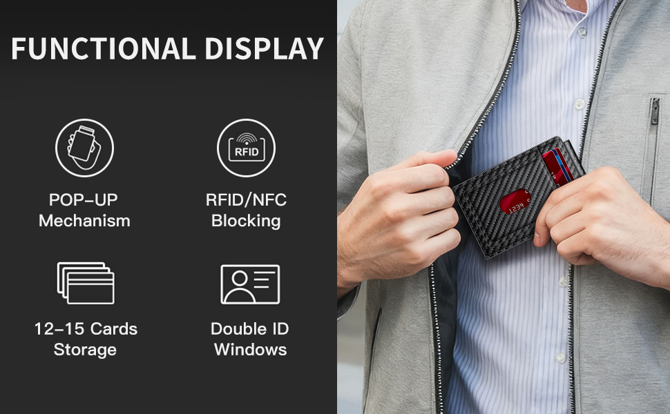 QUICK ACCESS FOR CARDS: This slim wallet is equipped with a aluminum pop up card box. Just press the button on bottom, the cards will slide out smoothly with a stepped layout for easy access