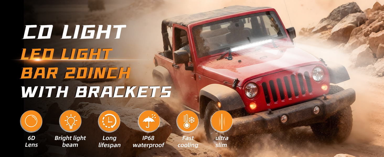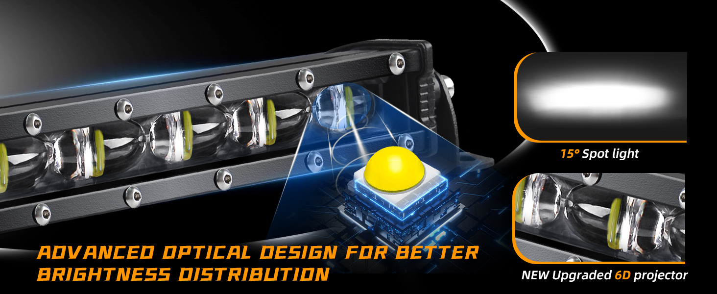 𝐒𝐮𝐩𝐞𝐫 𝐒𝐥𝐢𝐦 𝐃𝐞𝐬𝐢𝐠𝐧 & 𝟔𝐃 𝐋𝐞𝐧𝐬: One of the rare ultra-slim 20-inch LED light bars on the market. Its sleek, low-profile design integrates cleanly with a wide range of vehicles, mounting neatly on roofs, bumpers, grilles, or above windshields without adding bulk. Advanced 6D optical lenses deliver powerful, focused illumination—achieving an ideal balance between compact size and high-performance lighting
