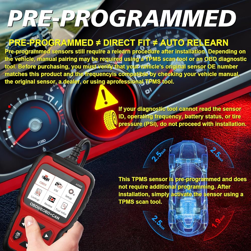 IMPORTANT REMINDER: Please verify fitment via the "Amazon Confirmed Fit" tool. Pre-programmed sensors still require a relearn procedure after installation. Depending on the vehicle, manual pairing may be required using a TPMS scan tool or an OBD diagnostic tool. Before purchasing, you must verify that your vehicle's original sensor OE number matches this product and the frequencyis compatible by checking your vehicle manual, the original sensor, a dealer, or using aprofessional TPMS tool.