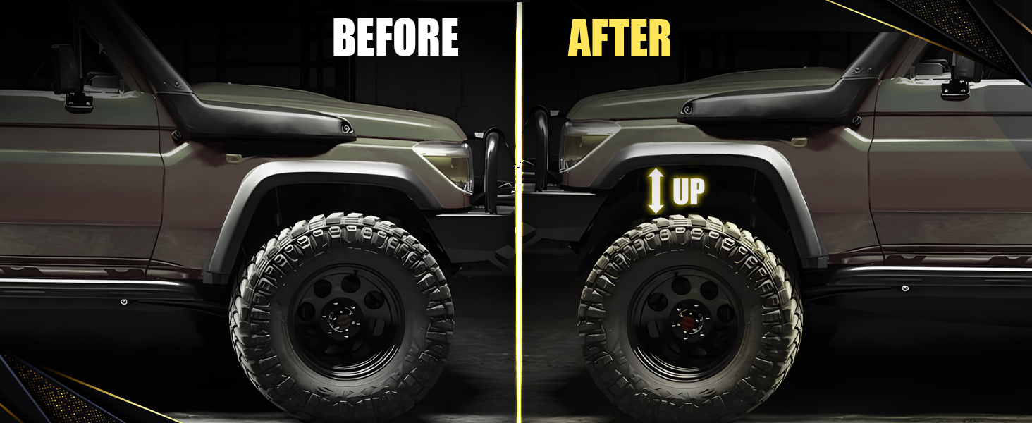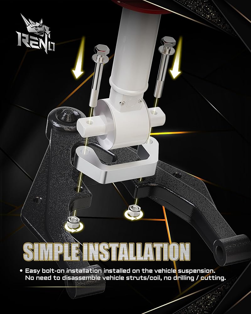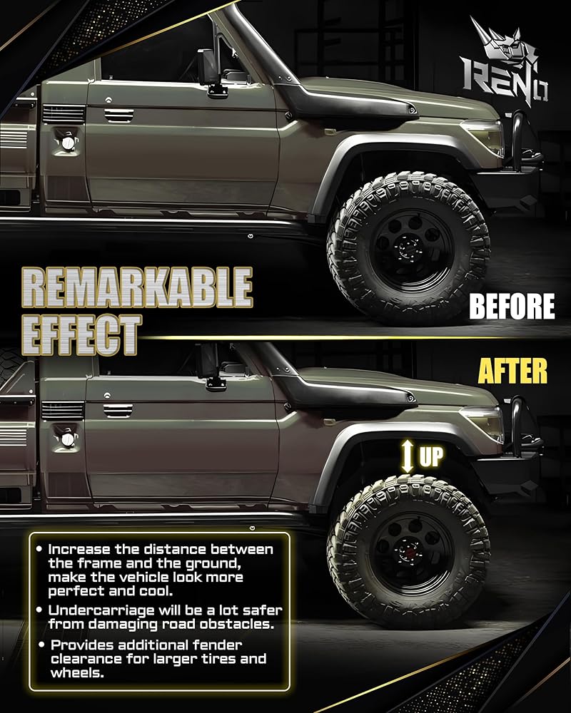 【Remarkable Effect】RENO Front Leveling Lift Kit levels the front and rear of the vehicle, increasing the vehicle's factory front camber; Provides additional fender clearance for larger tires and wheels; Increase the distance between the frame and the ground, make the vehicle look more perfect and cool.