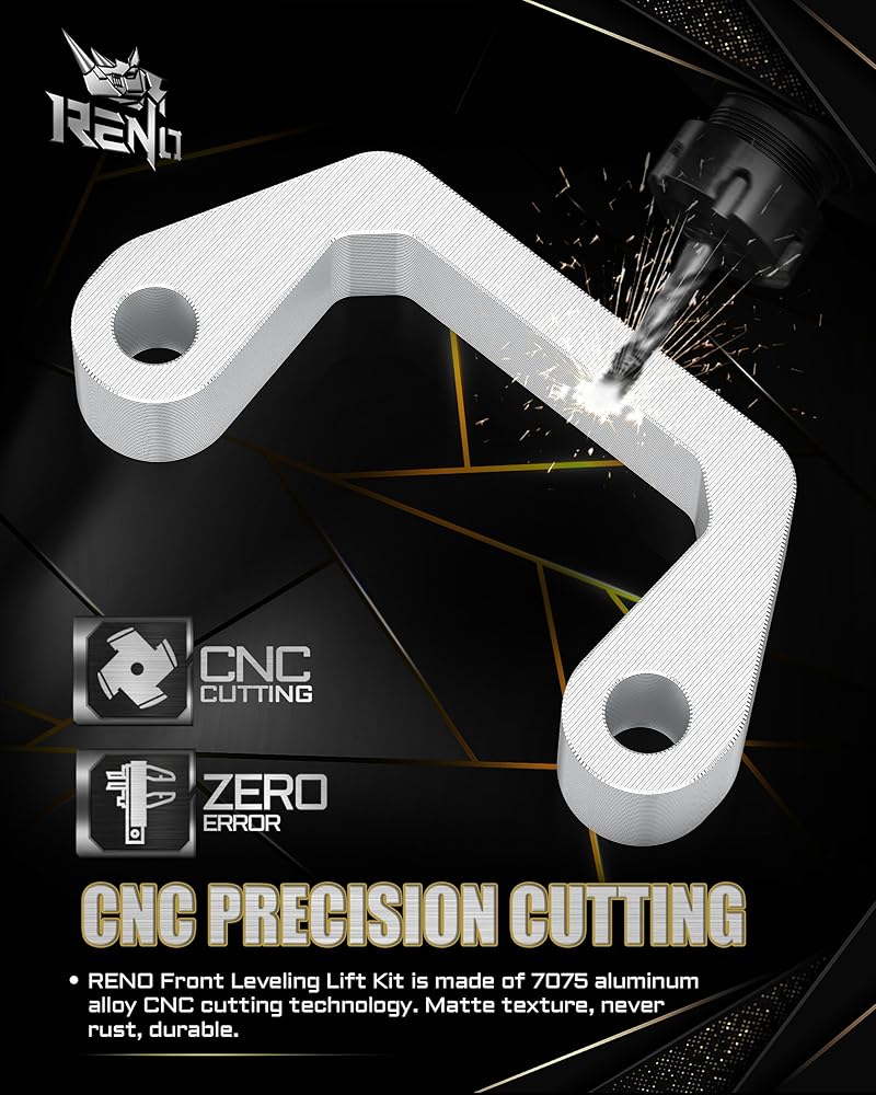 【Superior Material】RENO Front Leveling Lift Kit is made of 7075 aluminum alloy CNC cutting technology; Matte texture, never rust, sturdy. Compatible with the factory suspension system; Only fits vehicles with factory steel front lower control arms.