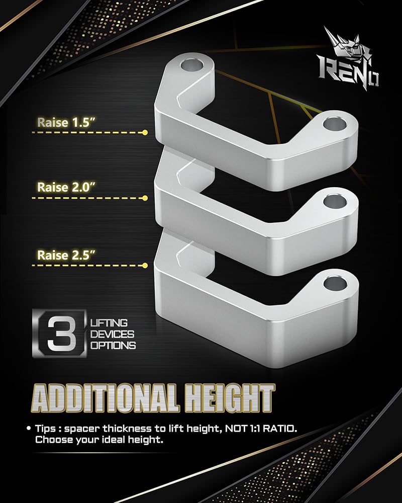 Important Tips】RENO leveling kit raises the front of the truck 2 inches, but the actual thickness is about 1 inch; The spacer thickness to lift height, NOT 1:1 RATIO. You can choose your ideal height