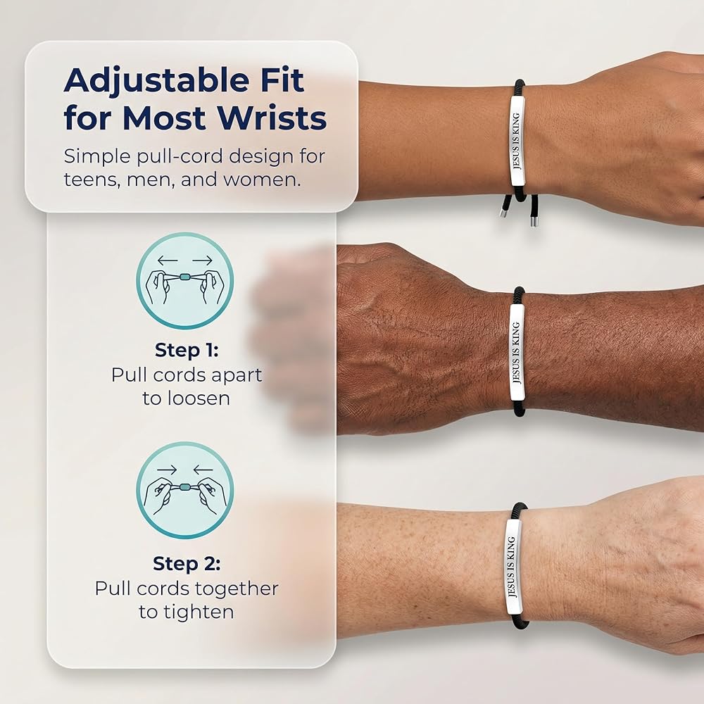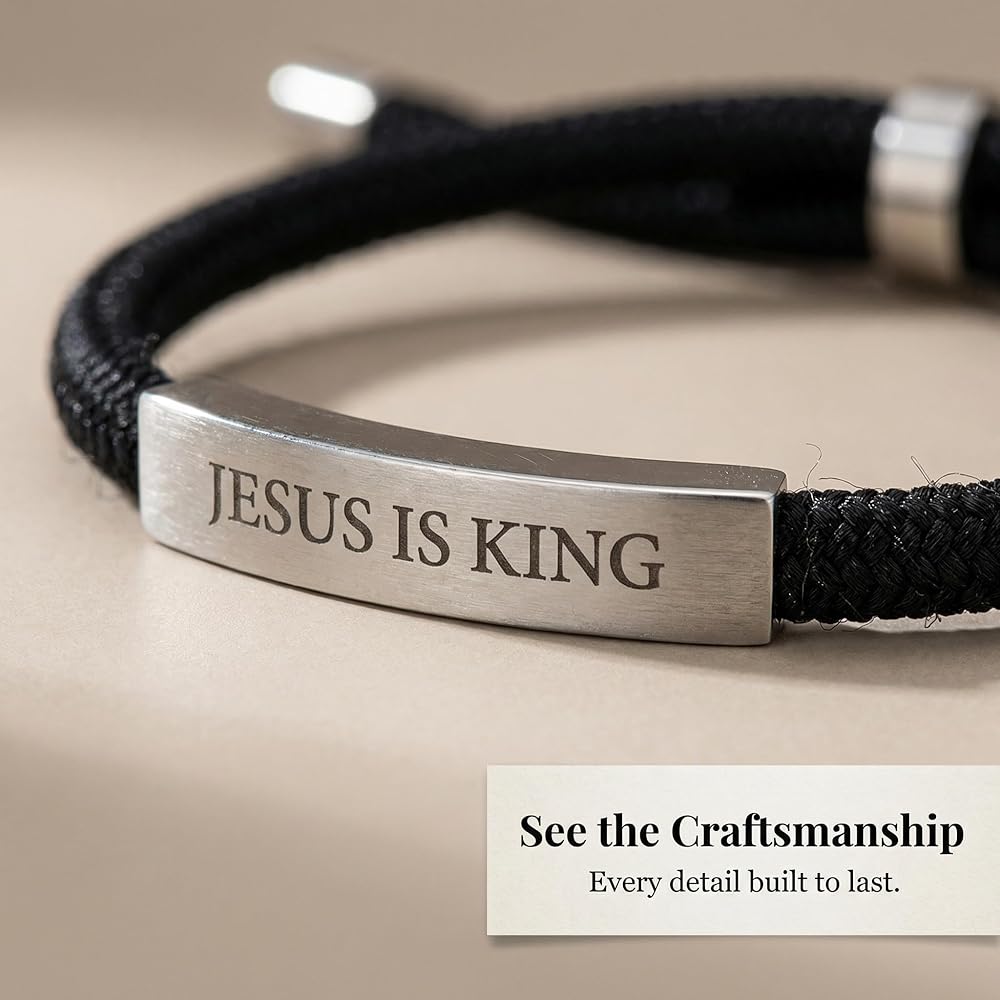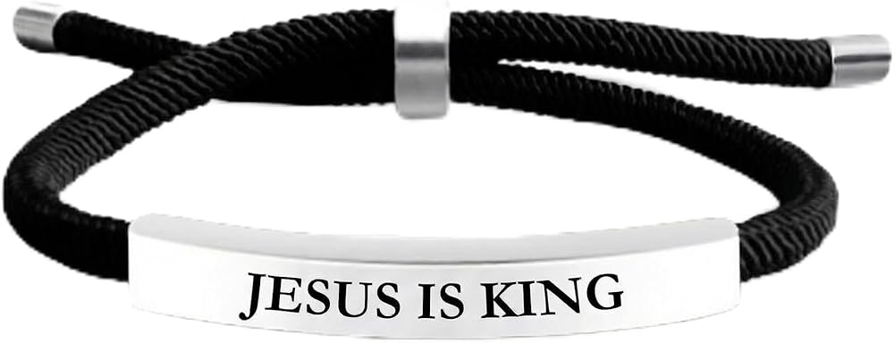 Introducing our Jesus is King High Quality Black Braided Rope Jesus Bracelet, a premier choice for those seeking meaningful mens Christian gifts. This exquisite piece of Christian jewelry is designed to inspire faith and devotion, making it an ideal selection for those searching for unique mens Christian bracelets. Crafted with precision, this bracelet features an engraved aluminum plate, ensuring durability and a lasting impression. Our bracelet serves as an eloquent expression of faith, making it suitable as a bible bracelet or a thoughtful baptism gift for boys. The bracelet's adjustable design ensures a comfortable fit for all, while its waterproof properties make it practical for everyday wear. As a cross bracelet for men, this piece not only symbolizes spiritual commitment but also complements any attire with its sophisticated black braided rope. This Jesus bracelet is more than just a piece of Christian accessories; it is a declaration of belief. Its design reflects a modern take on traditional Christian jewelry, offering a subtle yet powerful statement of faith. Perfect as a Christian gift or as part of a collection of Christian stuff, this bracelet is versatile enough to be worn on all occasions, whether casual or formal. The Jesus is King bracelet is also an ideal choice for those interested in WWJD bracelets and other spiritual bracelets for men. Its thoughtful design makes it a cherished addition to any collection of religious bracelets for men, providing a constant reminder of faith and devotion. As a Christian bracelet for men, it embodies a blend of style and spirituality, catering to those who appreciate both fashion and faith. Whether you're searching for a god bracelet for men, a prayer bracelet for men, or simply a faith bracelet men can wear with pride, this piece offers a timeless appeal. It stands out among mens religious bracelets and is perfect for those who value quality and craftsmanship in their Christian accessories for men. Embrace your faith with this elegant men's cross bracelet, a testament to the enduring power of belief.