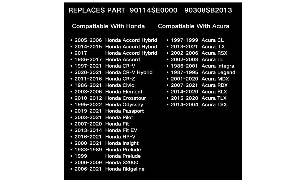Applicable Vehicle Models:Compatiable With 2005-2006 Accord Hybrid / 2014-2015 Accord Hybrid / /2017 Accord Hybrid / 1986-2017 Accord / 1997-2021 CR-V / 2020-2021 CR-V Hybrid / 2011-2016 CR-Z / 1986-2021 Civic / 2003-2006 Element / 2010-2012 Crosstour / 1995-2022 odyssey / 2019-2021 Passport / 2003-2021 Pilot / 2007-2020 Fit / 2013-2014 Fit EV / 2016-2021 HR-V / 2000-2021 Insight / 1988-1989 Prelude / 1999 Prelude / 2000-2009 S2000 / 2006-2021 Ridgeline