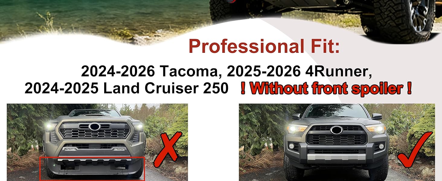 Professional Fit: Specifically designed and manufactured for the 2024-2026 Tacoma, 2025-2026 4Runner, and 2024-2025 Land Cruiser 250 without a front spoiler. Prioritized for TRD Off-Road, TRD Pro, and Trailhunter models. TRD Sport, Limited, and SR5 versions with a spoiler require removal of the spoiler before installation.