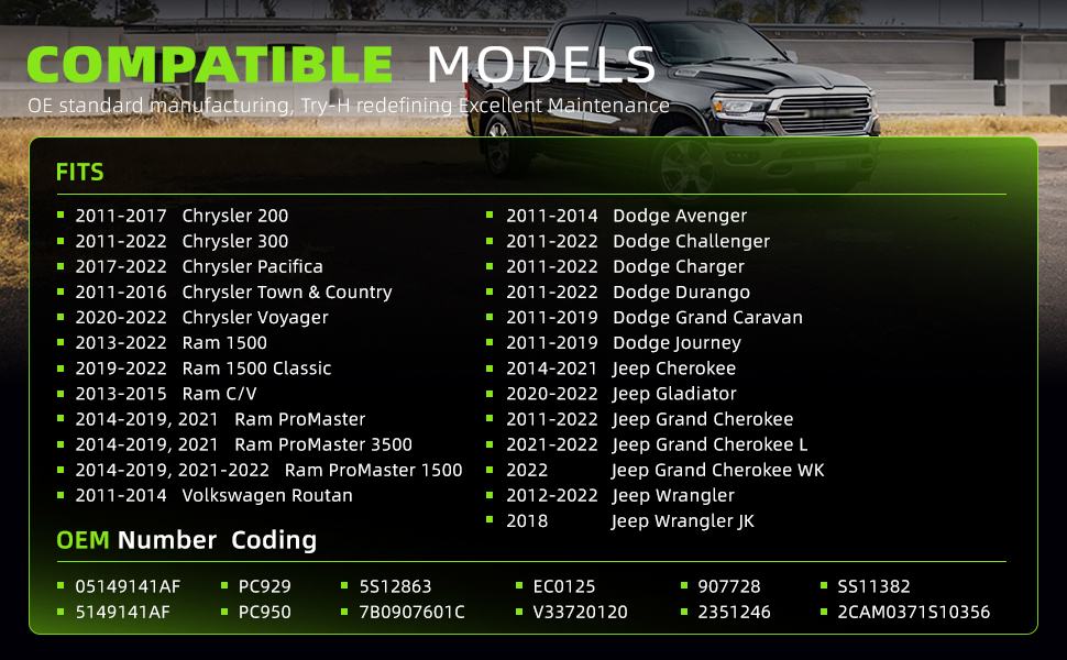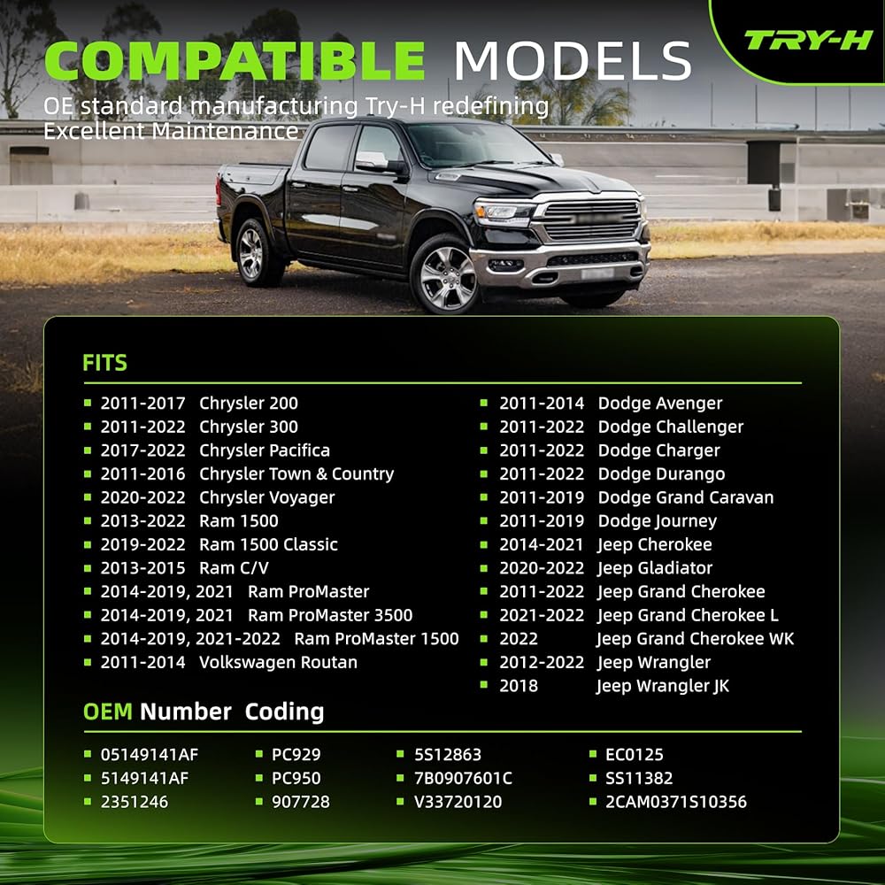 Compatbility: Ram 13-22 1500丨19-22 1500 Classic丨13-15 C/V丨14-19, 21-22 ProMaster 1500丨14-19, 21 ProMaster丨14-19, 21 ProMaster 3500; Chrysler 11-17 200丨11-22 300丨17-22 Pacifica丨11-16 Town & Country丨20-22 Voyager丨Dodge 11-14 Avenger丨11-22 Challenger丨11-22 Charger丨11-22 Durango丨11-19 Grand Caravan丨11-19 Journey; Jeep 14-21 Cherokee丨20-22 Gladiator丨11-22 Grand Cherokee丨21-22 Grand Cherokee L丨22 Grand Cherokee WK丨12-22 Wrangler丨18 Wrangler JK丨11-14 Volkswagen Routan.