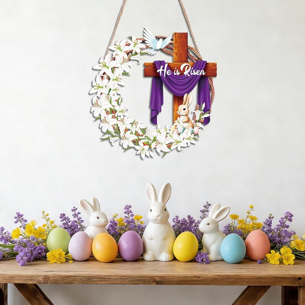 He is Risen Easter Wooden Wreaths, 12 Inch Bunny Eggs Cross Wood Wreath Decorations, Easter Jesus Lily Front Door Wall Hanging Signs for Spring Holiday Festival Indoor Outdoor Farmhouse Home Decor