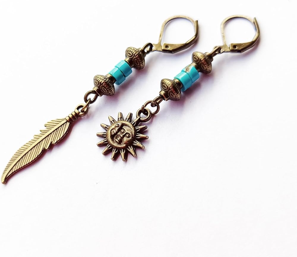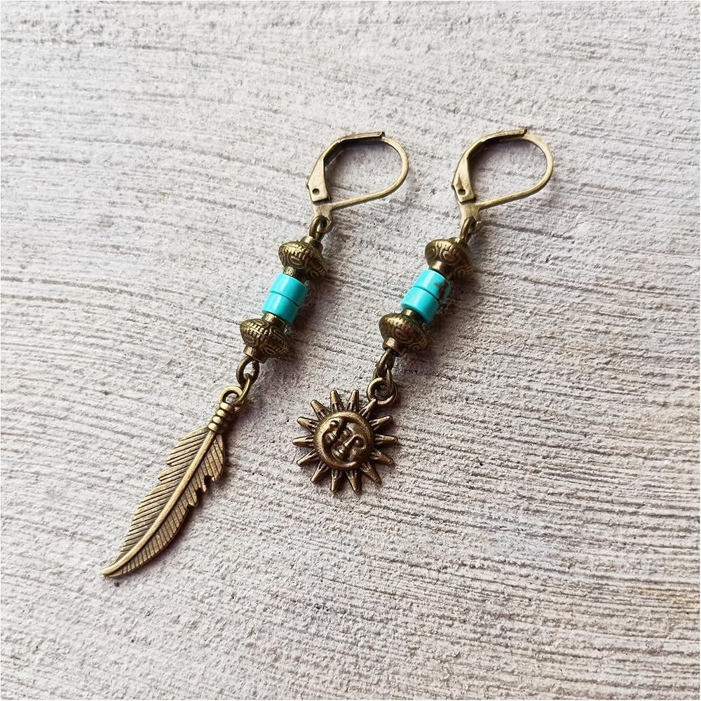 Bronze Turquoise Men Earrings Set of Two Feather Sun and Moon - Single Hippie Hoop Earrings Gemstone - Dangle Pirate Men's Earring - Tribal Man Earring