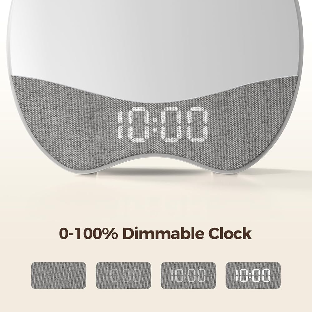 Sleep-Friendly Dimmable Nightlight&Display: the soft red and green nightlights offer 10 brightness levels, while the 0–100% adjustable screen ensures the perfect glow. A cozy, fabric-covered display emits a warm, non-intrusive light — ideal for kids' bedside tables.