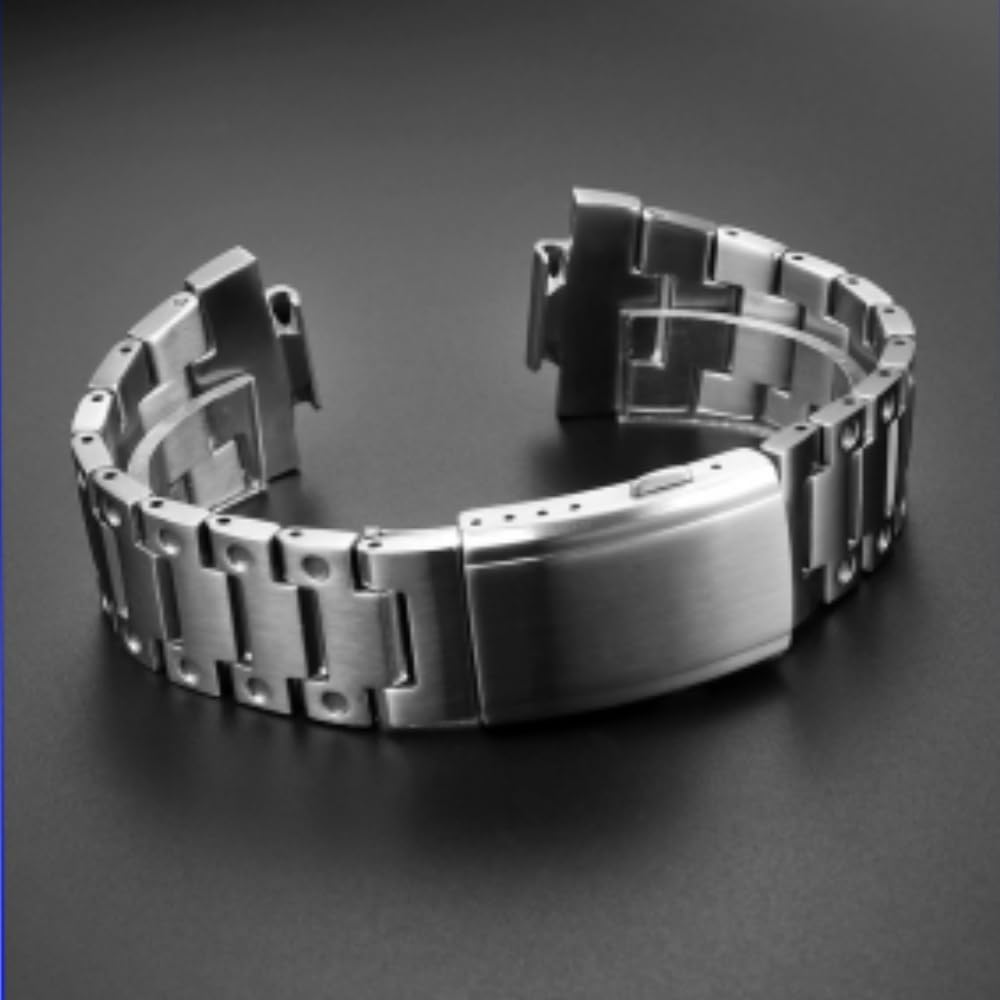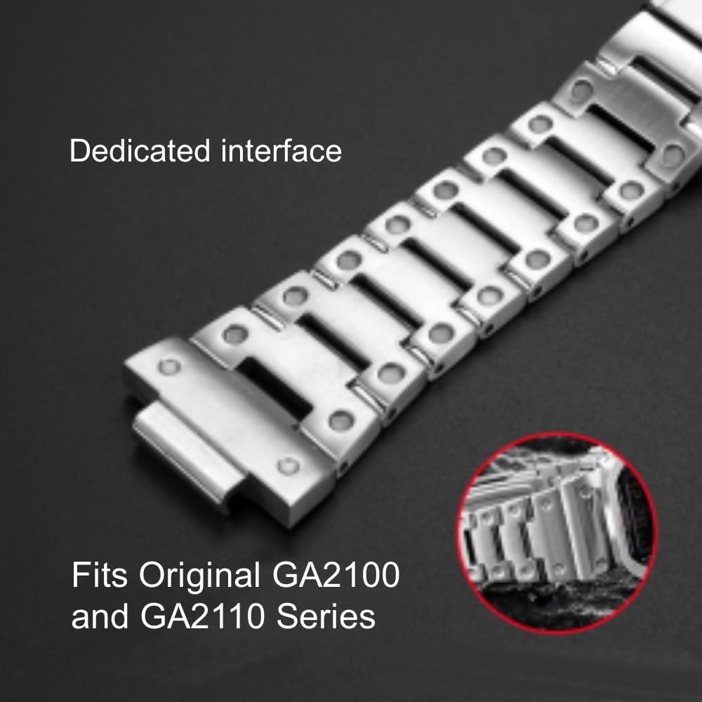 This stainless steel replacement band is crafted for the CASIO GA-2100 and GA-2110 series, adding a rugged metal aesthetic of the watch.