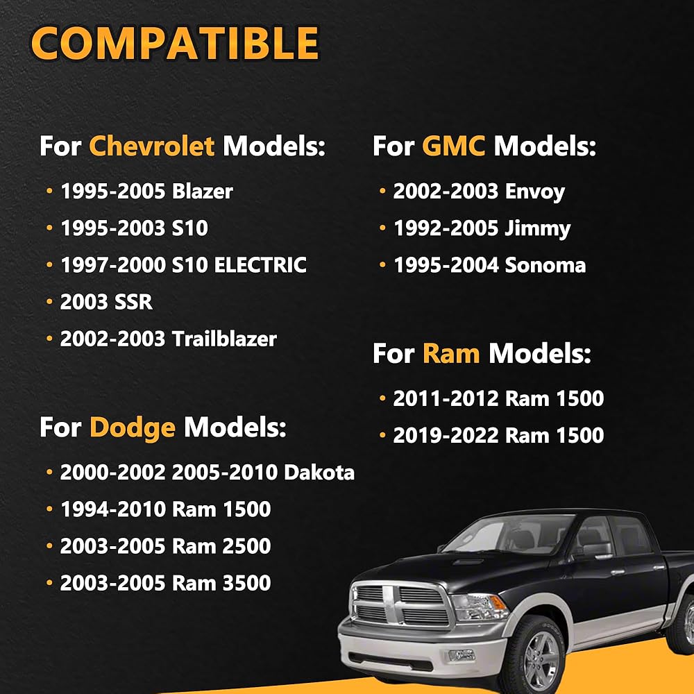 • 【Fitments】For 1994-2010 Dodge Ram 1500 V6 V8 / 2003-2005 Ram 2500 V6 V8 / 2003-2005 Ram 3500 V6 V8,For 1995-2003 S10 L4 V6/1995-2005 Blazer V6, For 1995-2004 GMC Sonoma V6 L4