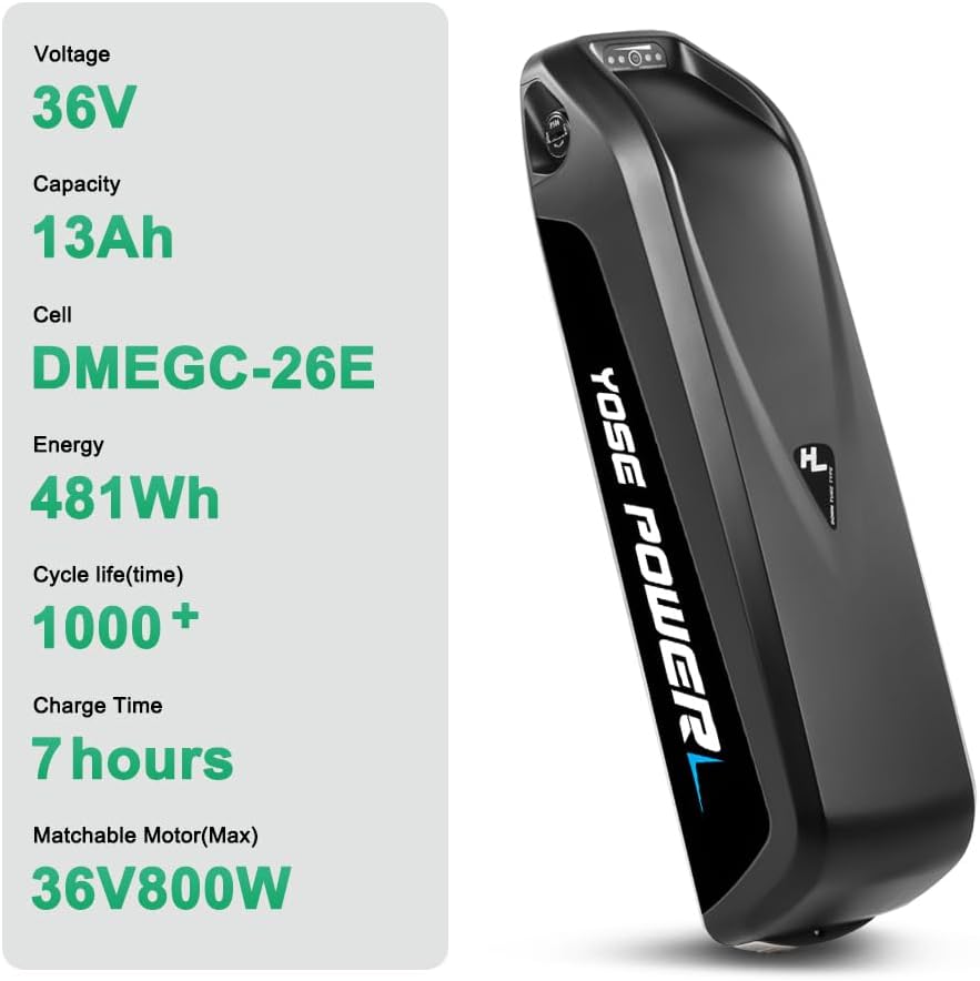 【LONG-LASTING PERFORMANCE】With a capacity of 13Ah and a discharge current of 10A, this battery is built to go the distance. Experience long-lasting performance with Yose Power's high-performance 36V ebike battery. With a capacity of 13Ah and a discharge current of 10A, this battery is built to go the distance.