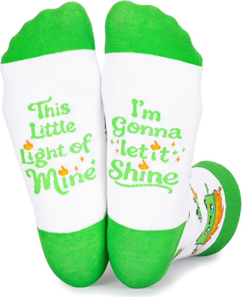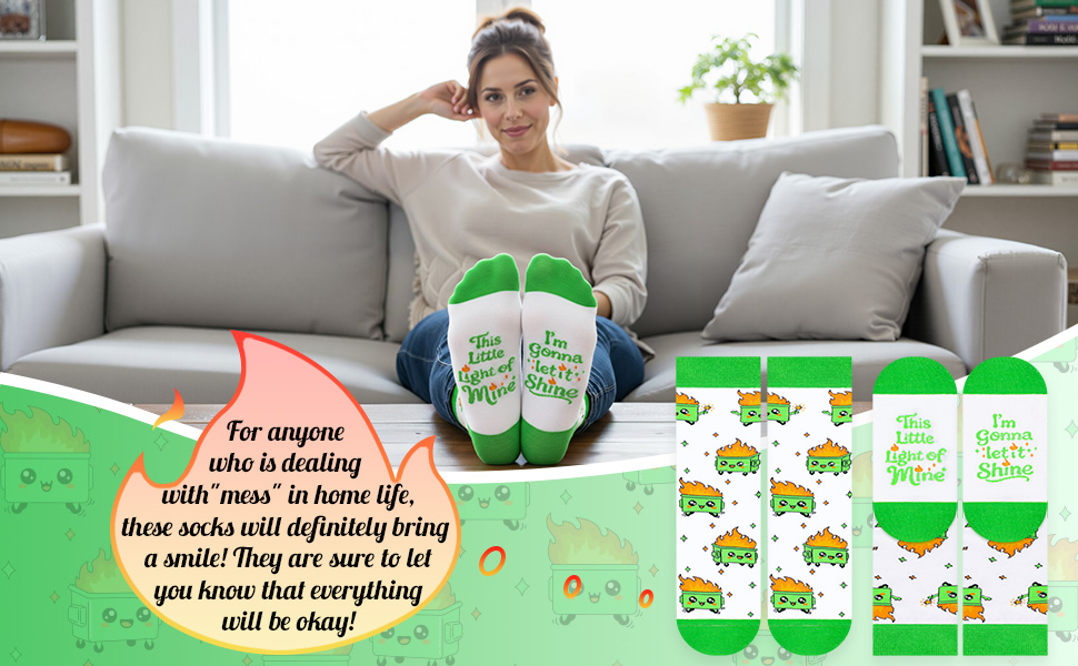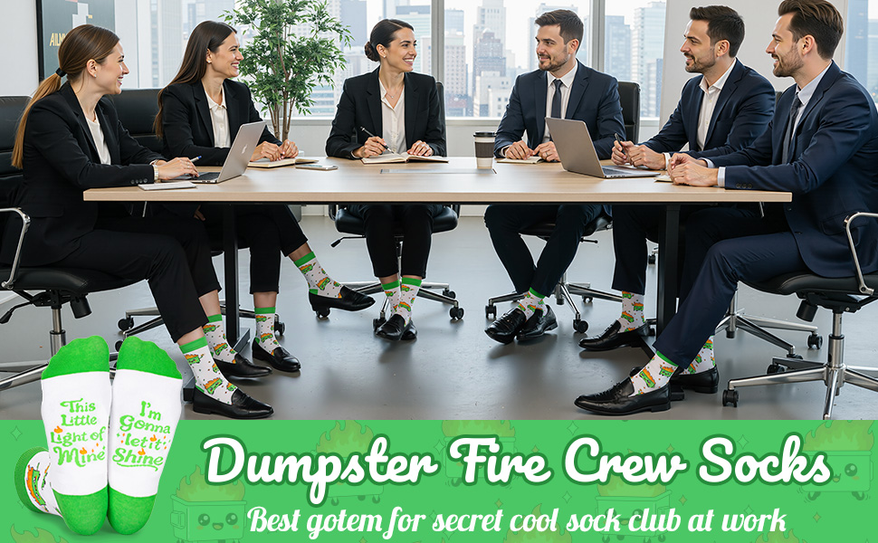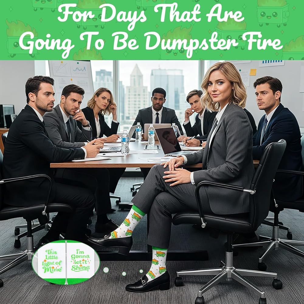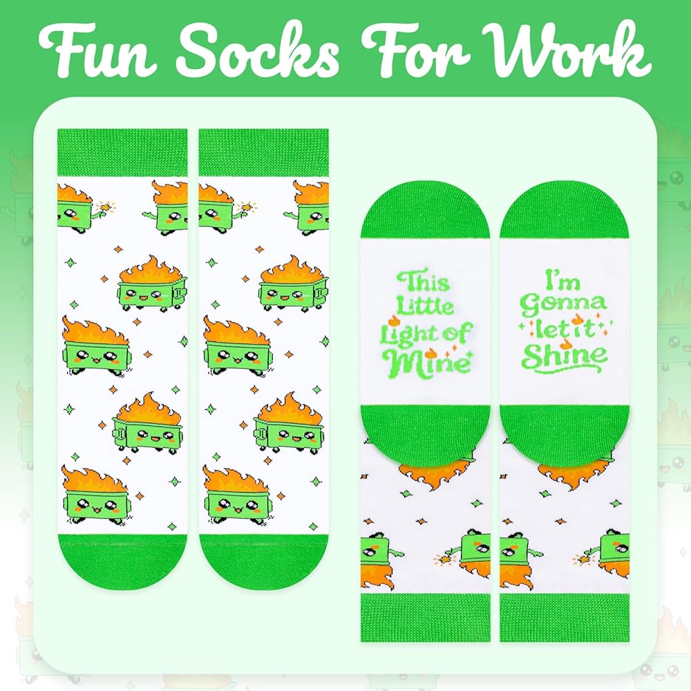 Dumpster Fire Socks For The Modern Warrior: Embrace the chaos with our hilarious dumpster fire socks, featuring flaming trash and sparkling stars; A perfect ironic gift for anyone facing Monday blues or endless meetings, with a hidden sole message that says 'This Little Light of MINE, I'm Gonna Let It SHINE' to lighten the workday grind